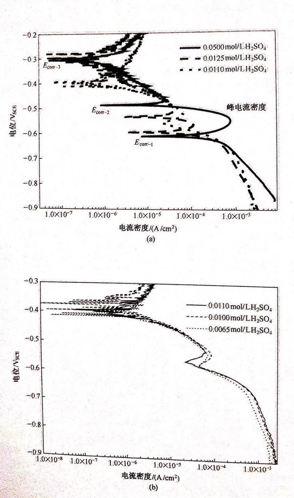 通過改變溶液的硫酸濃度來研究pH值的變化對雙相不銹鋼在H2SO4+0.5mol/L NaCl中的腐蝕行為的影響。圖5.22是不同硫酸濃度條件下雙相不銹鋼在H2SO4+0.5mol/L NaCl溶液中的極化曲線,從極化曲線中擬合的自腐蝕電位和腐蝕電流密度的值列于表5.8中。從圖5.8中可以看出,pH值對雙相不銹鋼在NaCI溶液中的腐蝕行為有顯著影響,并且可以改變自腐蝕電位的個數,當硫酸濃度大于0.011mol/L時出現三個自腐蝕電位,如圖5.22(a)所示;當硫酸濃度介于0.0065~0.011mol/L之間時出現兩個自腐蝕電位,如圖5.22b)所示;當硫酸濃度降低到0.005mol/L時只有一個自腐蝕電位,如圖5.22c)所示。