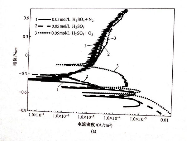 為了研究溶液中的(de)溶解氧對雙(shuang)相不銹鋼在H2SO4+0.5mol/L NaCl 溶液中的腐蝕行為的影響,分別選取雙相不銹鋼在出現三個、兩個和一個自腐蝕電位的特殊情況下的三種溶液成分,研究了溶液的氧濃度對雙相不銹鋼的腐蝕行為的影響。圖5.23為所測量的極化曲線,從圖中可以看到在氧飽和的0.05mol/L H2SO4+0.5mol/L NaCl溶液和0.011mol/L H2SO4+0.5mol/L NaCl溶液中(圖5.23(a)、(b)),氧濃度的變化不能改變自腐蝕電位的個數,但是在0.005mol/L H2SO4+0.5mol/L NaCl溶液中(圖5.22(c))卻可以使自腐蝕電位的個數從1個增加到2個。表5.9中所列的自腐蝕電位和腐蝕電流密度的值是通過圖5.23擬合后得到的。在氧飽和的溶液中測得的Ecorr-3值均高于在空氣飽和的溶液中的測量值,且腐蝕電流密度icorr-3也顯著增加。將待測溶液用氮氣飽和,以消除溶液中的溶解氧對陰極過程的影響,發現與除氧前的結果相比,除氧后測得的極化曲線的自腐蝕電位和腐蝕電流密度都有所降低。這表明溶液中的溶解氧參與了金屬的電極反應過程,溶液中的陰極反應是氧的還原反應和氫還原反應的疊加。
