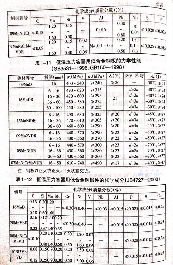 低(di)(di)(di)合金(jin)低(di)(di)(di)溫(wen)(wen)(wen)用鋼(gang)一般是(shi)通(tong)過合金(jin)元(yuan)素的(de)(de)固溶(rong)強化(hua)、晶粒細化(hua),并通(tong)過正火(huo)或(huo)正火(huo)+回火(huo)處理細化(hua)組織晶粒,從而(er)獲得(de)良好(hao)的(de)(de)低(di)(di)(di)溫(wen)(wen)(wen)韌(ren)性。在(zai)低(di)(di)(di)溫(wen)(wen)(wen)用鋼(gang)中(zhong)常(chang)用合金(jin)元(yuan)素是(shi)Mn、Ni、V、Nb等(deng),如我國低(di)(di)(di)溫(wen)(wen)(wen)壓力容器用鋼(gang)09Mn2VDR、15MnNiDR及(ji)09MnNiDR等(deng),為保(bao)證低(di)(di)(di)溫(wen)(wen)(wen)韌(ren)性,在(zai)低(di)(di)(di)溫(wen)(wen)(wen)用鋼(gang)中(zhong)盡量(liang)降(jiang)低(di)(di)(di)碳含量(liang),并嚴格控制硫、磷含量(liang)。低(di)(di)(di)合金(jin)低(di)(di)(di)溫(wen)(wen)(wen)用鋼(gang)還有相(xiang)應(ying)的(de)(de)鑄件、鍛(duan)件及(ji)管材,JB4727-2000中(zhong)對5種常(chang)用的(de)(de)低(di)(di)(di)合金(jin)低(di)(di)(di)溫(wen)(wen)(wen)鋼(gang)鍛(duan)件的(de)(de)化(hua)學成分(fen)、力學性能(neng)做出了規定,見表(biao)(biao)1-12及(ji)表(biao)(biao)1-13所示。