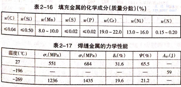 目前(qian),0Cr21Ni6Mn9N鋼的焊(han)(han)接還僅局限于TIG焊(han)(han)和(he)真空電子束(shu)焊(han)(han)接。填充金(jin)屬的化(hua)學成分見(jian)表2-16.焊(han)(han)縫金(jin)屬的力學性(xing)能如表2-17所示。