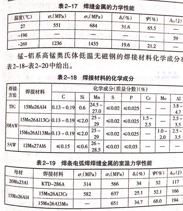 錳-鋁(lv)系高錳奧氏(shi)體(ti)低溫(wen)無磁鋼的焊接材料化學成分在(zai)表2-18~表2-20中給(gei)出。