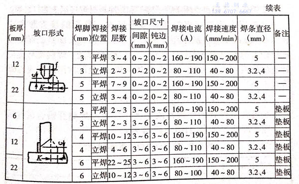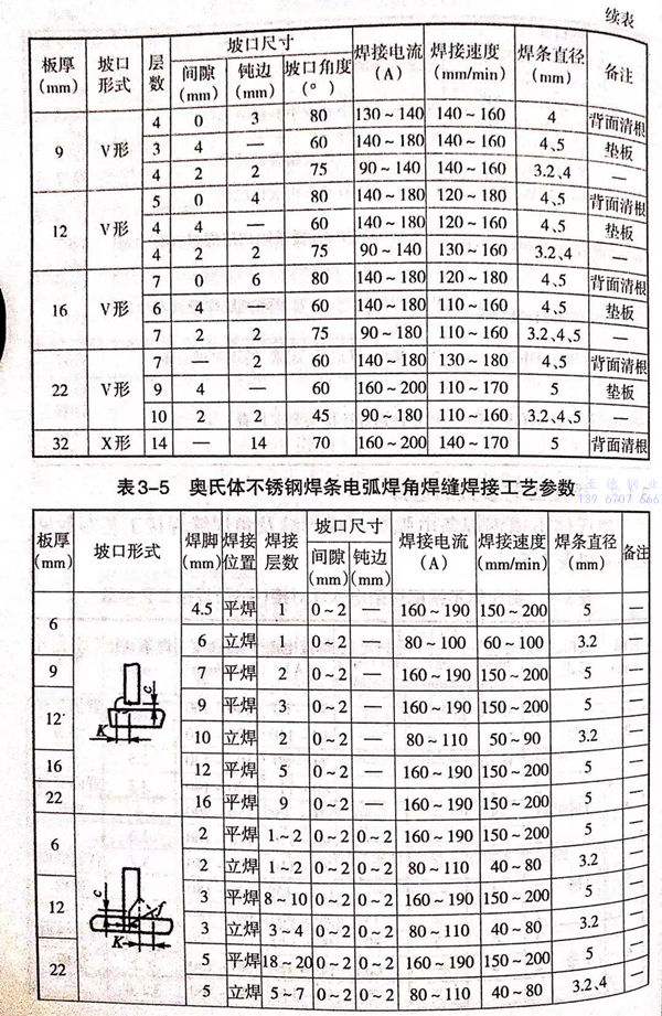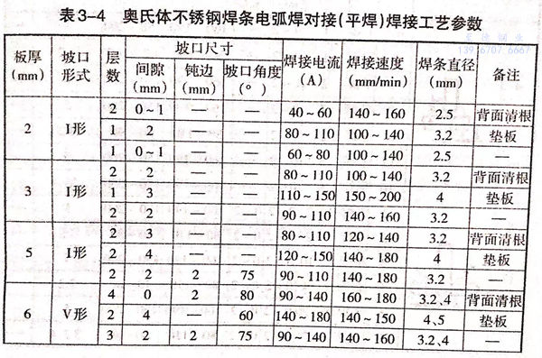 奧氏體不銹鋼焊條電弧焊對接焊縫及角焊焊縫焊接工藝參數(shu)見表(biao) 3-4 和 表(biao) 3-5。