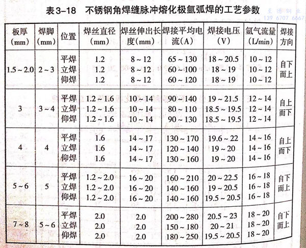 不(bu)(bu)銹(xiu)(xiu)鋼(gang)脈(mo)沖(chong)熔(rong)(rong)化(hua)極(ji)氬弧焊(han)(han)采(cai)用直徑(jing)1.6mm以下的(de)細絲和使用小于臨界電流的(de)平(ping)(ping)均電流值進行(xing)焊(han)(han)接。這時電弧穩定,能(neng)通(tong)過調整(zheng)脈(mo)沖(chong)工藝參(can)數調節焊(han)(han)縫(feng)成(cheng)形,細化(hua)焊(han)(han)縫(feng)組織和提高其抗裂紋能(neng)力(li)。平(ping)(ping)焊(han)(han)位置不(bu)(bu)銹(xiu)(xiu)鋼(gang)(18-8)脈(mo)沖(chong)熔(rong)(rong)化(hua)極(ji)氬弧焊(han)(han)的(de)工藝參(can)數見(jian)表(biao)3-16.全位置不(bu)(bu)銹(xiu)(xiu)鋼(gang)脈(mo)沖(chong)熔(rong)(rong)化(hua)極(ji)氬弧焊(han)(han)工藝參(can)數見(jian)表(biao)3-17。