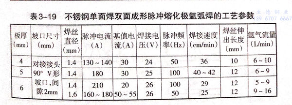 不銹(xiu)鋼角焊縫及單面(mian)焊雙面(mian)成形(xing)脈沖(chong)熔化(hua)極氬弧(hu)焊的工藝參數見表3-18和表3-19。