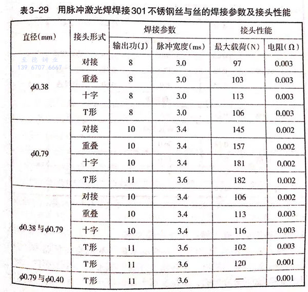 表(biao)3-29 用脈沖激光(guang)焊焊接301不銹鋼絲與絲的(de)焊接參數及(ji)接斗性能(neng)