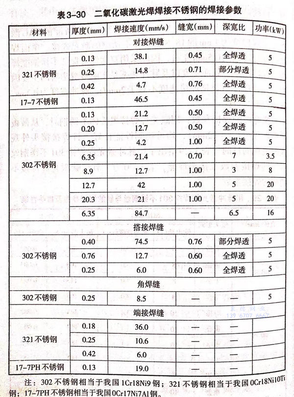 激光焊(han)的焊(han)接參數(shu):用激光焊焊接奧氏(shi)體不(bu)銹鋼時,從薄板到中厚度(0.1~12mm),均可達到性能良好,且焊接接頭外觀成形美觀的目的。表3-29 給出了用脈沖激光焊焊接301不銹鋼絲與絲的焊接參數及接頭性能,表3-30為二氧化碳激光焊焊接不銹鋼的焊接參數。
