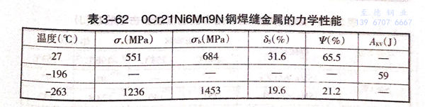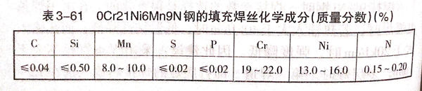 目前,0Cr21Ni6Mn9N鋼的焊接還僅限于TIG焊及真空電子束焊接。焊接參數可參照不銹(xiu)鋼。填充焊絲的化學成分見表3-61.焊縫金屬的力學性能見表3-62。