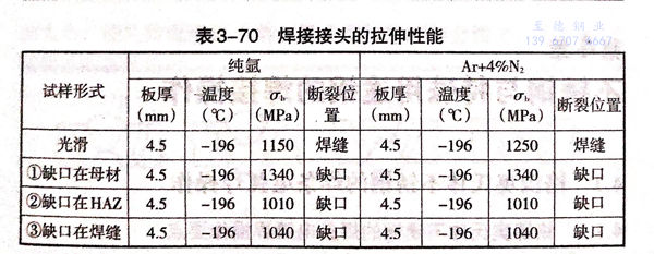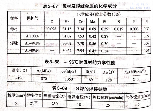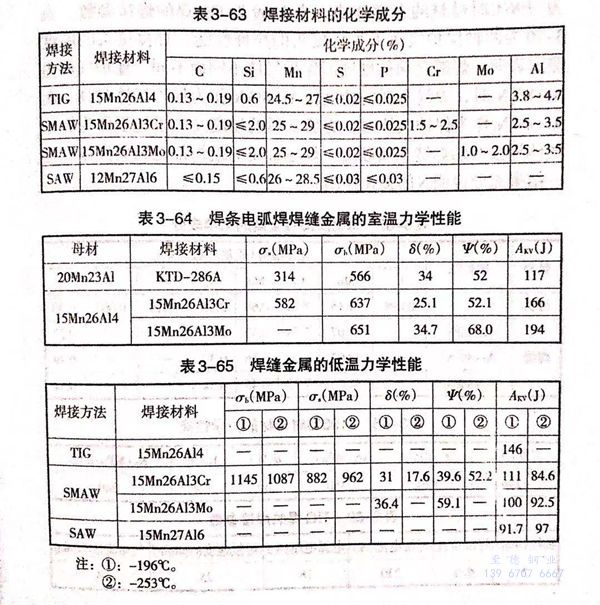 15Mn26Al14鋼可用SWAM、SAW及(ji)TIG方法焊(han)接,其所用焊(han)接材料(liao)及(ji)力學性能在表3-63~表3-66中給出。