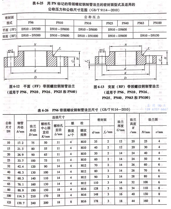 1. 用PN標記的帶頸螺紋鋼制管法蘭:用PN標記的帶頸螺紋鋼制管法蘭密(mi)封面型式及適用的公稱壓力和公稱尺寸范圍見表6-25; 用PN標記的帶頸螺紋鋼制管法蘭的型式見圖6-12~圖6-13,尺寸見表6-26~表6-32。