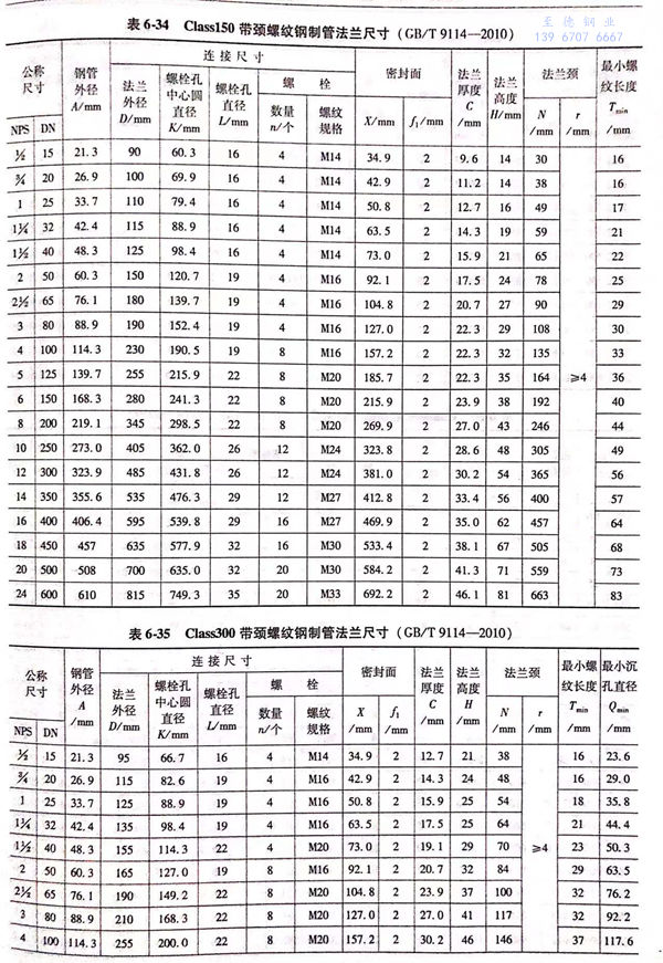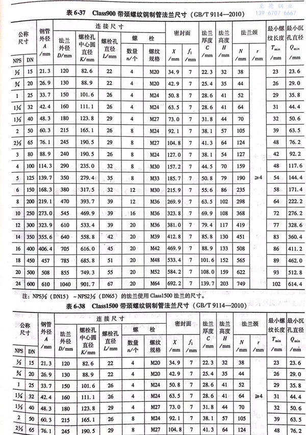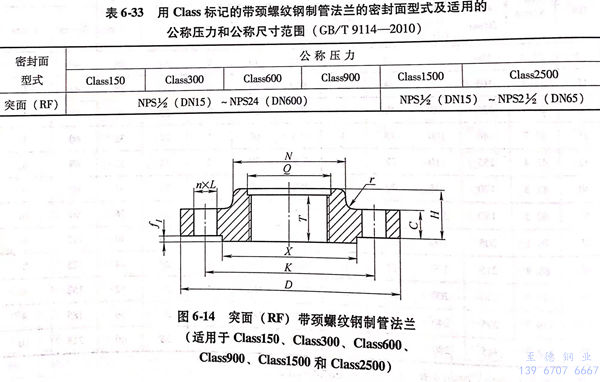 2. 用(yong)Class標記(ji)的(de)(de)(de)帶(dai)頸螺紋鋼制(zhi)(zhi)管(guan)法(fa)蘭:用(yong)Class標記(ji)的(de)(de)(de)帶(dai)頸螺紋鋼制(zhi)(zhi)管(guan)法(fa)蘭的(de)(de)(de)密封面型(xing)式及適用(yong)的(de)(de)(de)公(gong)稱壓力和(he)公(gong)稱尺寸范(fan)圍見表6-33;用(yong)Class標記(ji)的(de)(de)(de)帶(dai)頸螺紋鋼制(zhi)(zhi)管(guan)法(fa)蘭的(de)(de)(de)型(xing)式見圖6-14,尺寸見表6-34~表6-39。