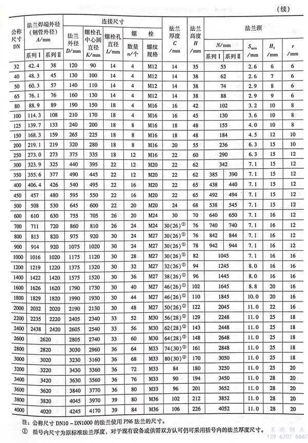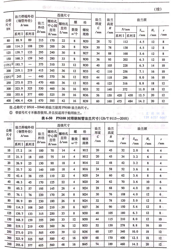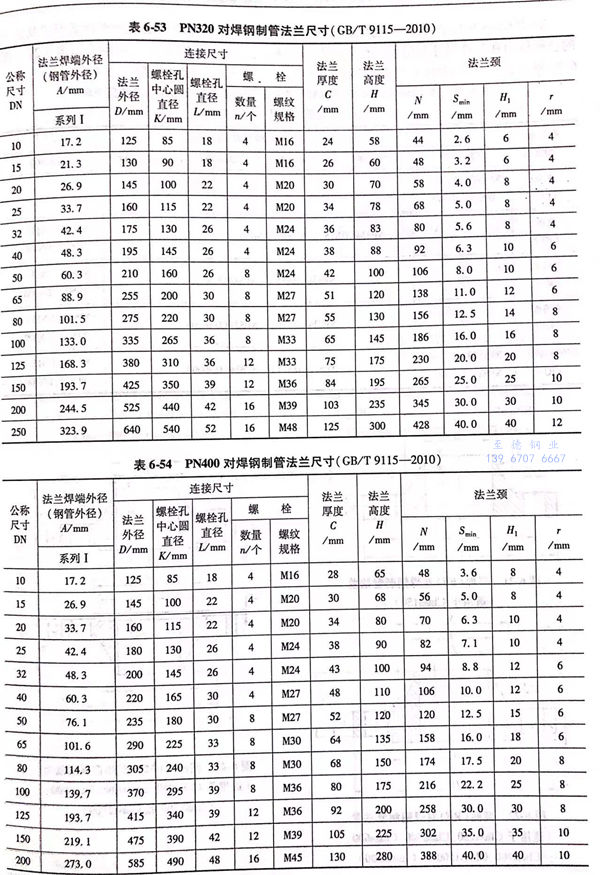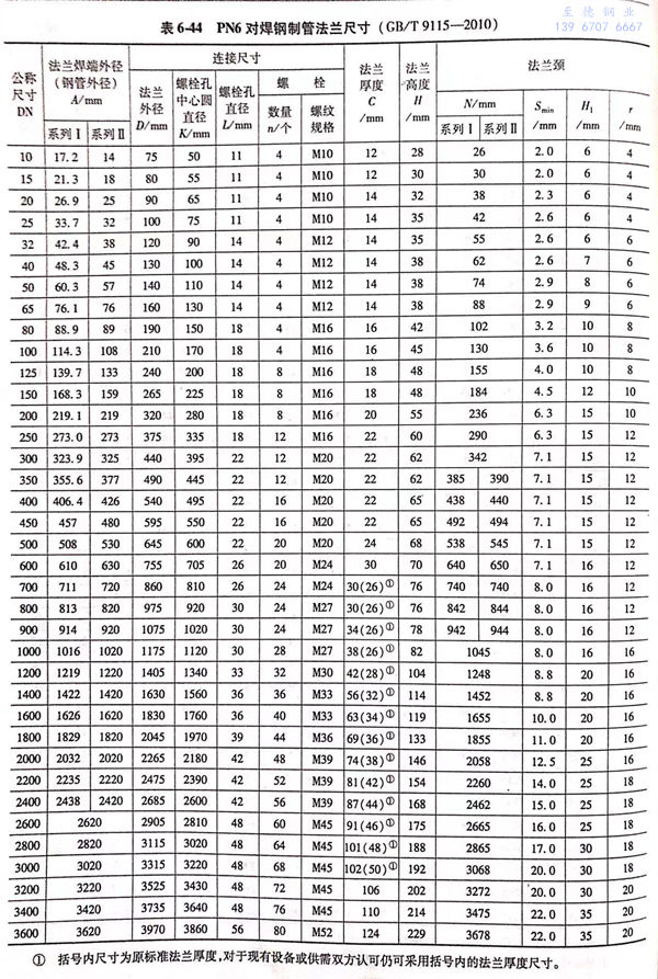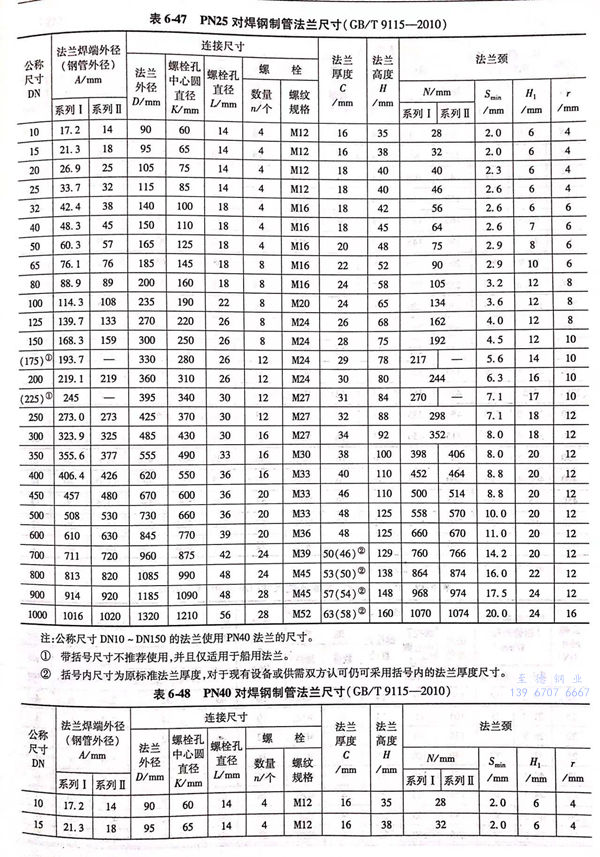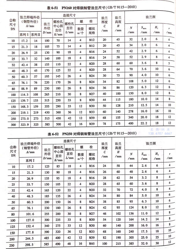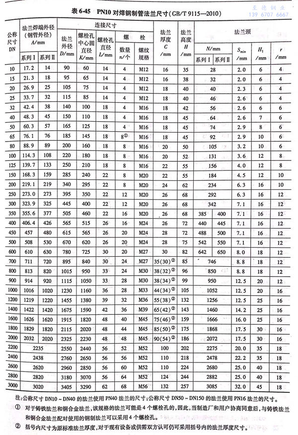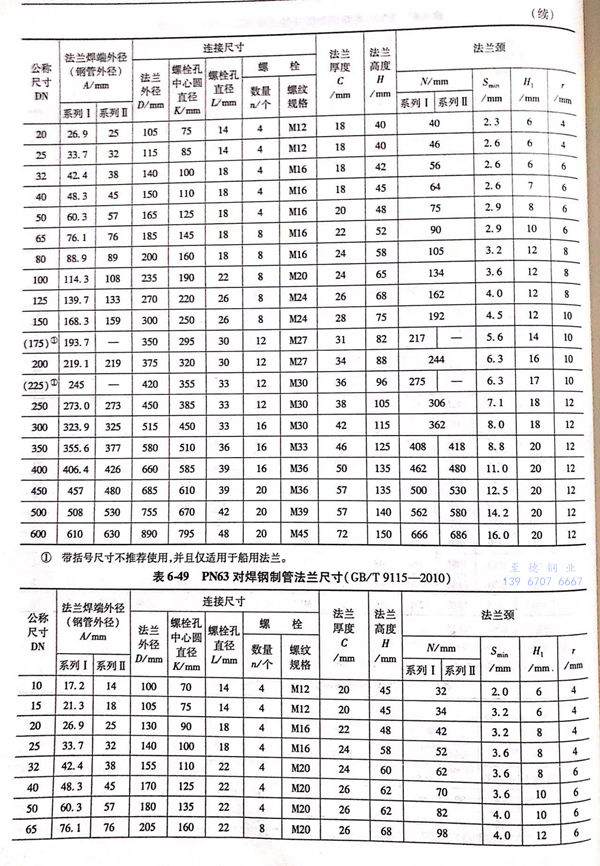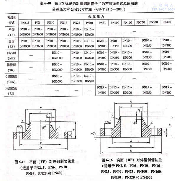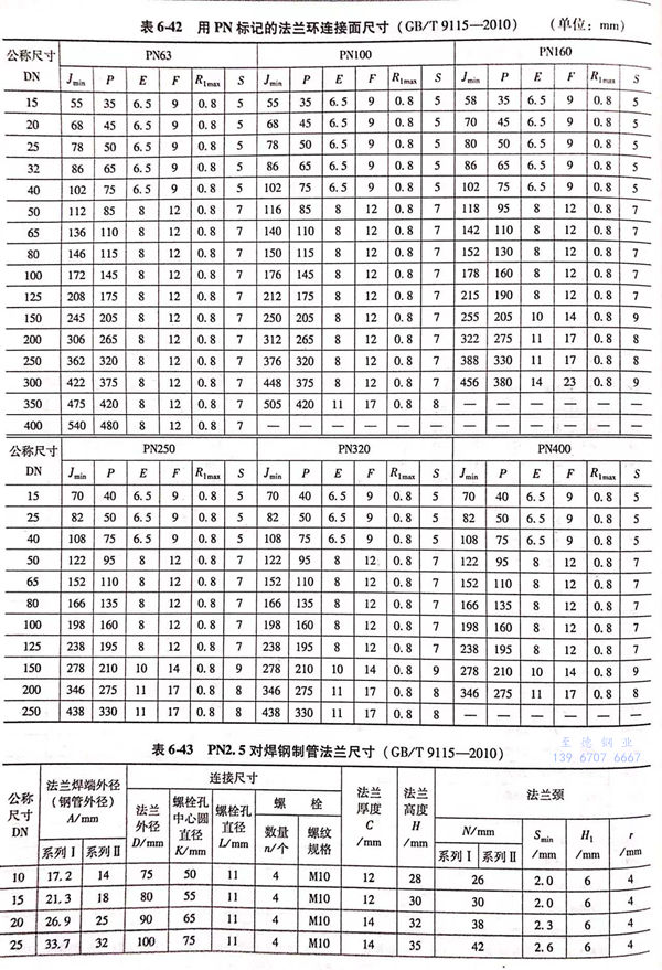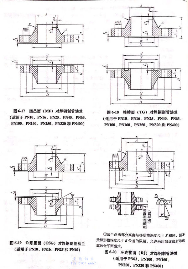 用PN標記的對焊鋼制管(guan)法蘭(lan)的密封面型式及適用的公稱壓力和公稱尺寸范圍見表6-40;用PN標記的對焊鋼制管法蘭的型式如圖6-15~圖6-20所示,法蘭密(mi)封面尺寸見表6-41和表6-42,法蘭結構尺寸見表6-43~表6-54。