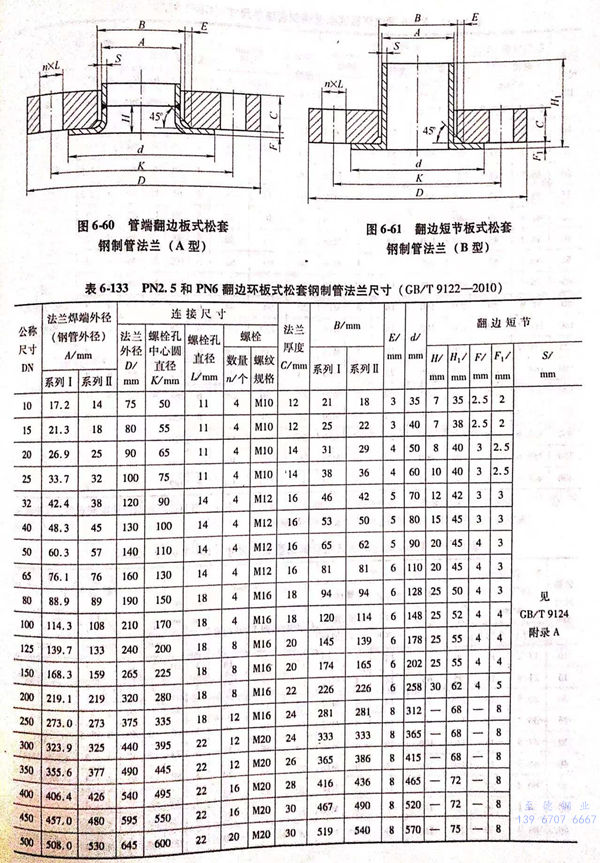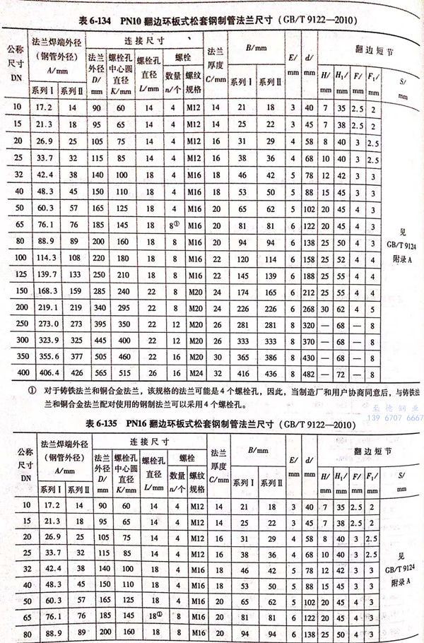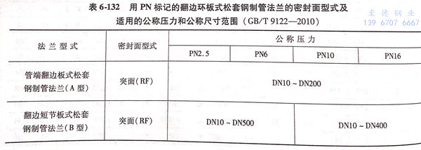 翻(fan)邊(bian)(bian)環板式(shi)(shi)松套(tao)法蘭包括用(yong)(yong)PN標記的管(guan)端翻(fan)邊(bian)(bian)板式(shi)(shi)松套(tao)鋼(gang)制管(guan)法蘭(A型(xing))和翻(fan)邊(bian)(bian)短節(jie)板式(shi)(shi)松套(tao)鋼(gang)制管(guan)法蘭(B型(xing))兩類,其密封(feng)面型(xing)式(shi)(shi)及適用(yong)(yong)的公(gong)稱(cheng)壓力和公(gong)稱(cheng)尺寸(cun)范圍見(jian)表6-132;用(yong)(yong)PN標記的翻(fan)邊(bian)(bian)環板式(shi)(shi)松套(tao)鋼(gang)制管(guan)法蘭的型(xing)式(shi)(shi)如圖(tu)6-60~圖(tu)6-61所示,法蘭結構尺寸(cun)或尺寸(cun)見(jian)表6-133~表6-135。