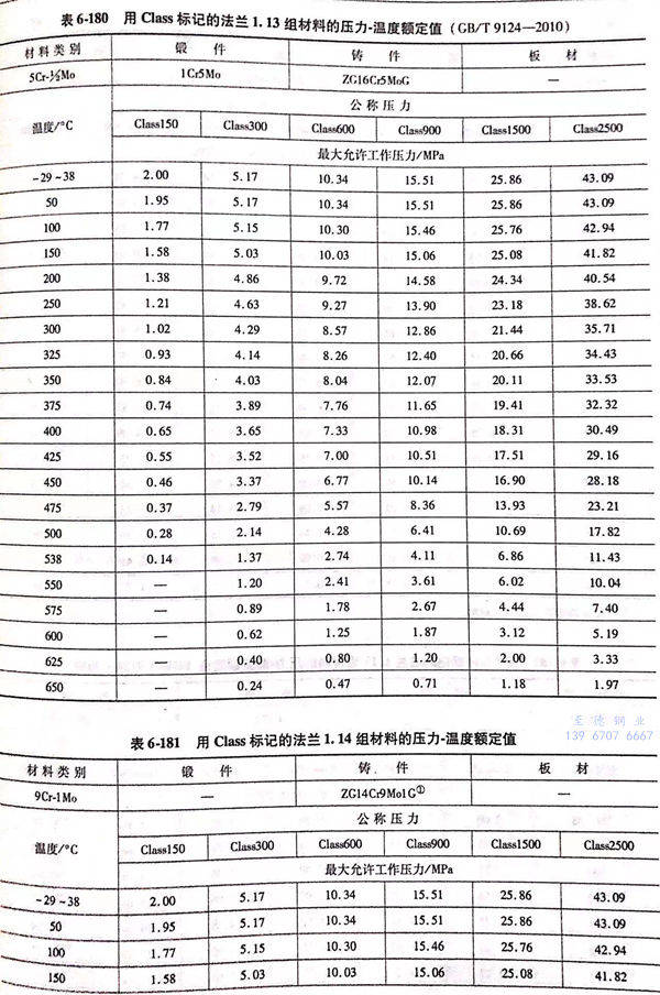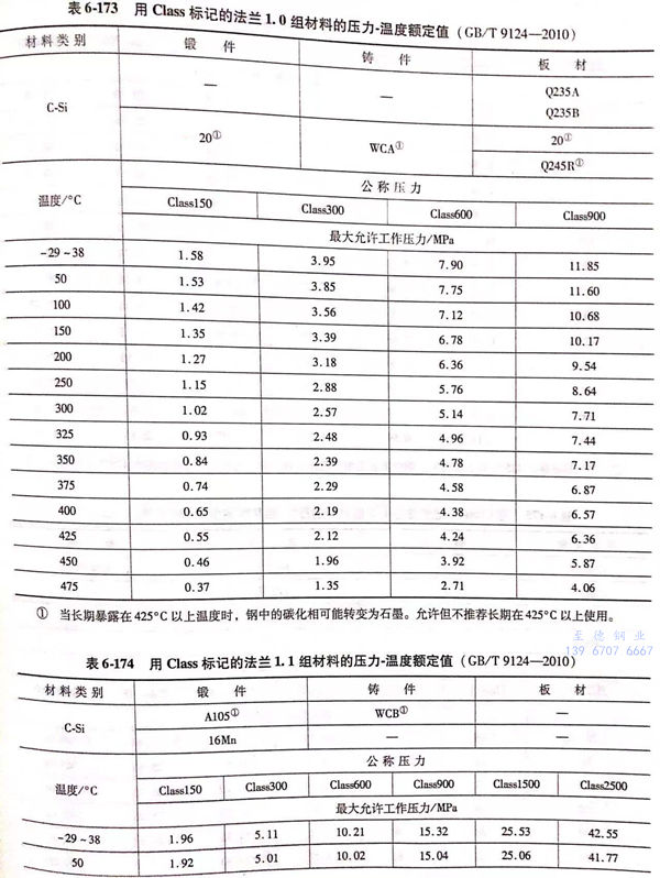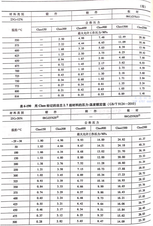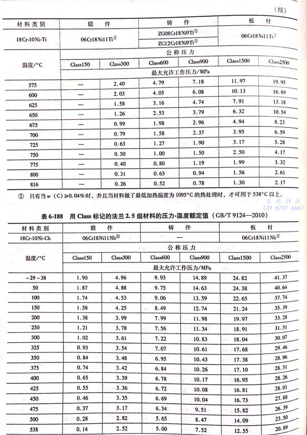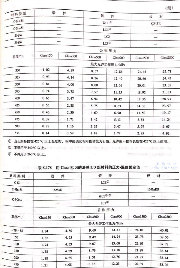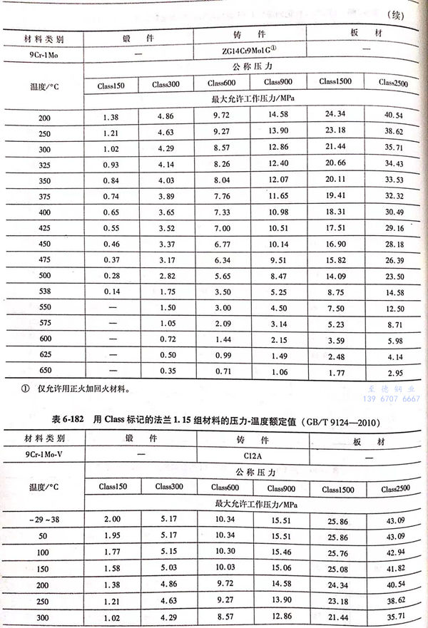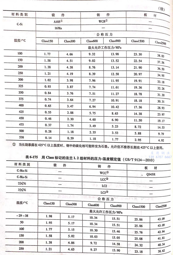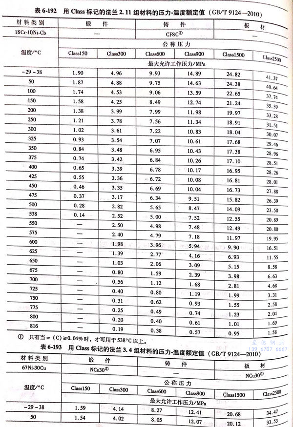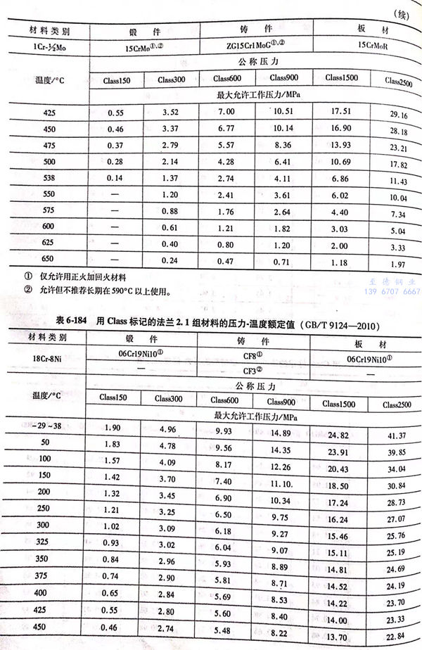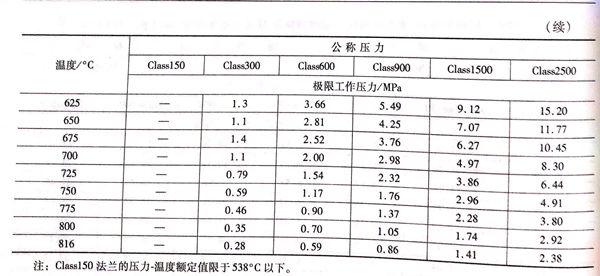用(yong) Class標(biao)記的(de)法蘭壓力(li)-溫(wen)度額定值(zhi)(zhi)見表6-173~表6-193;用(yong)Class標(biao)記法蘭的(de)壓力(li)-溫(wen)度極(ji)(ji)限(xian)額定值(zhi)(zhi)見表6-194.表6-173~表6-193所定的(de)法蘭壓力(li)-溫(wen)度額定值(zhi)(zhi)不(bu)得超過表6-194規定的(de)極(ji)(ji)限(xian)額定值(zhi)(zhi)。