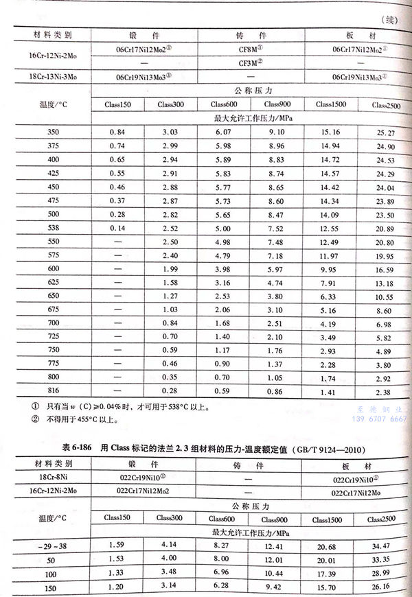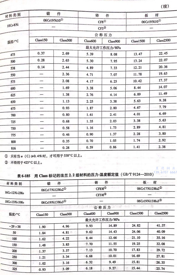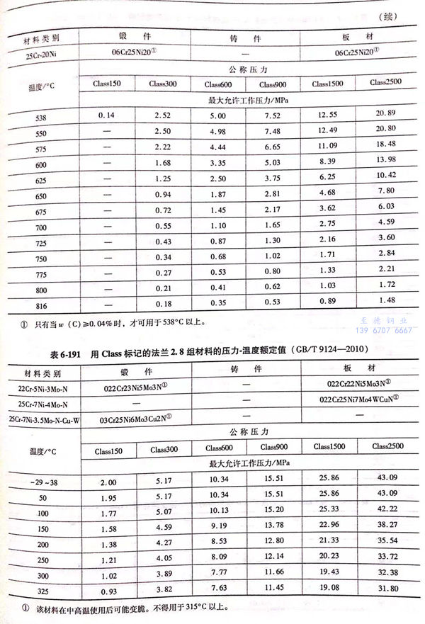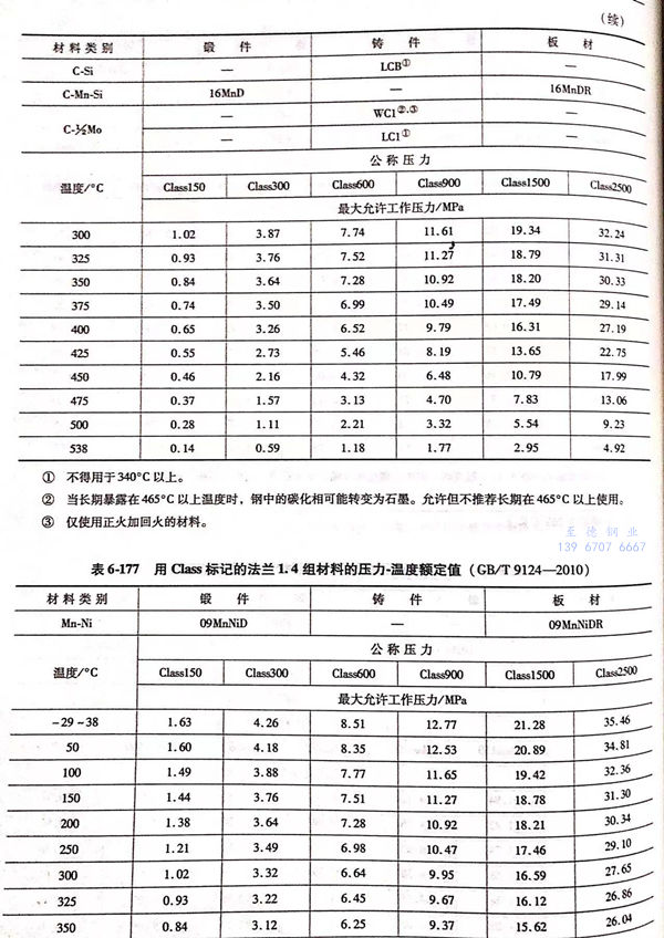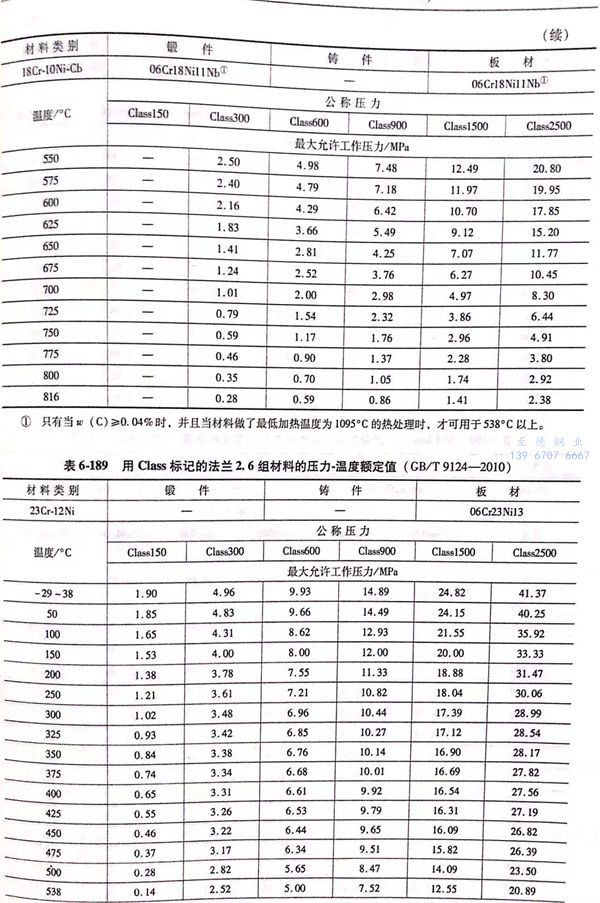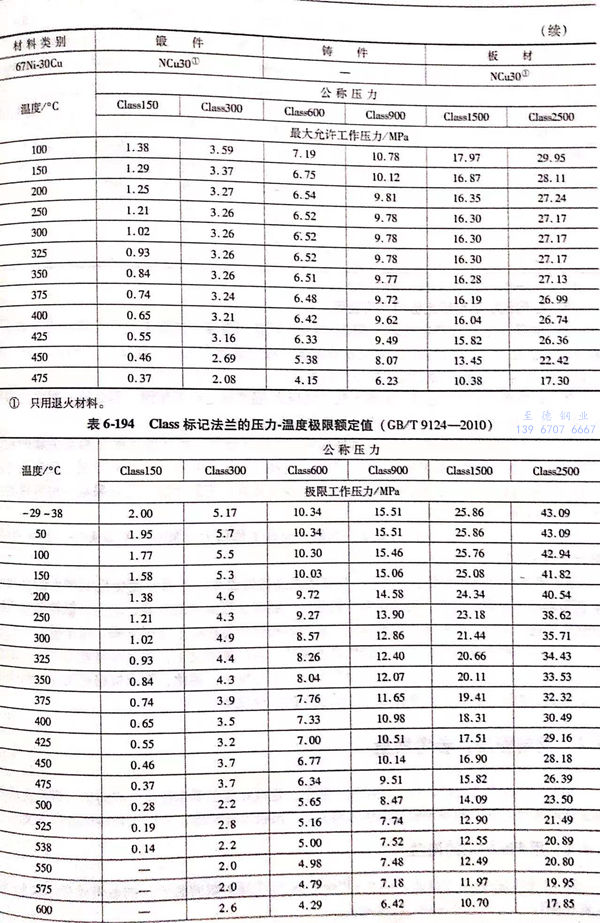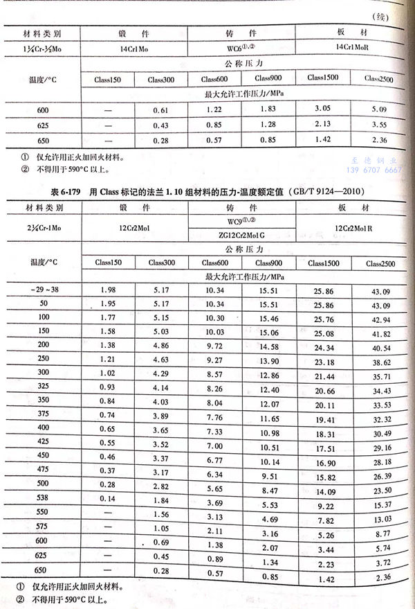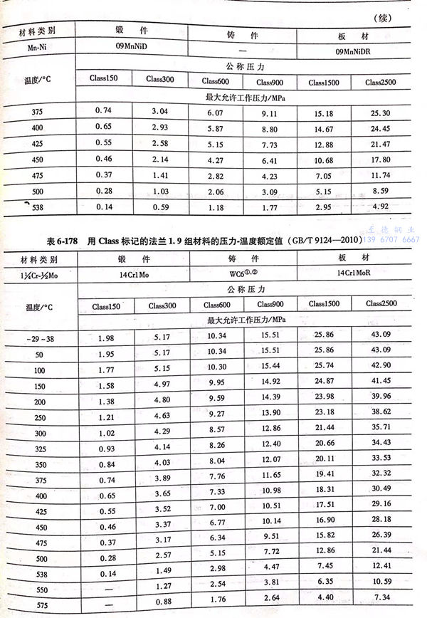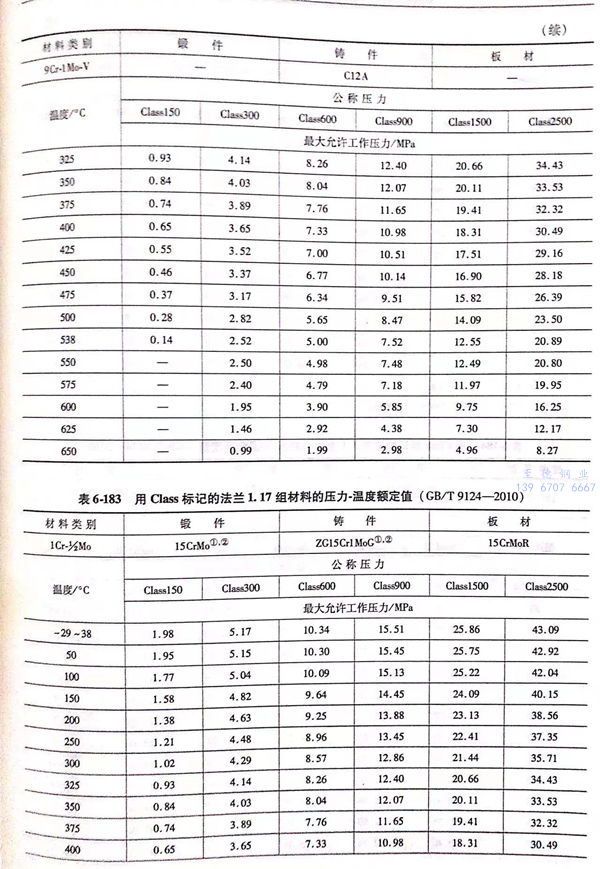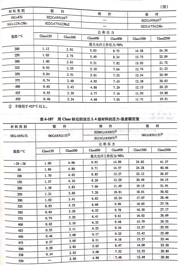用(yong) Class標(biao)記的(de)法蘭壓力(li)-溫(wen)度額定值(zhi)(zhi)見表6-173~表6-193;用(yong)Class標(biao)記法蘭的(de)壓力(li)-溫(wen)度極(ji)(ji)限(xian)額定值(zhi)(zhi)見表6-194.表6-173~表6-193所定的(de)法蘭壓力(li)-溫(wen)度額定值(zhi)(zhi)不(bu)得超過表6-194規定的(de)極(ji)(ji)限(xian)額定值(zhi)(zhi)。