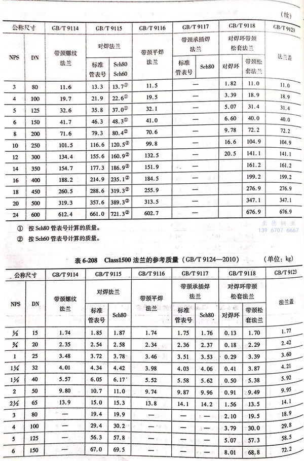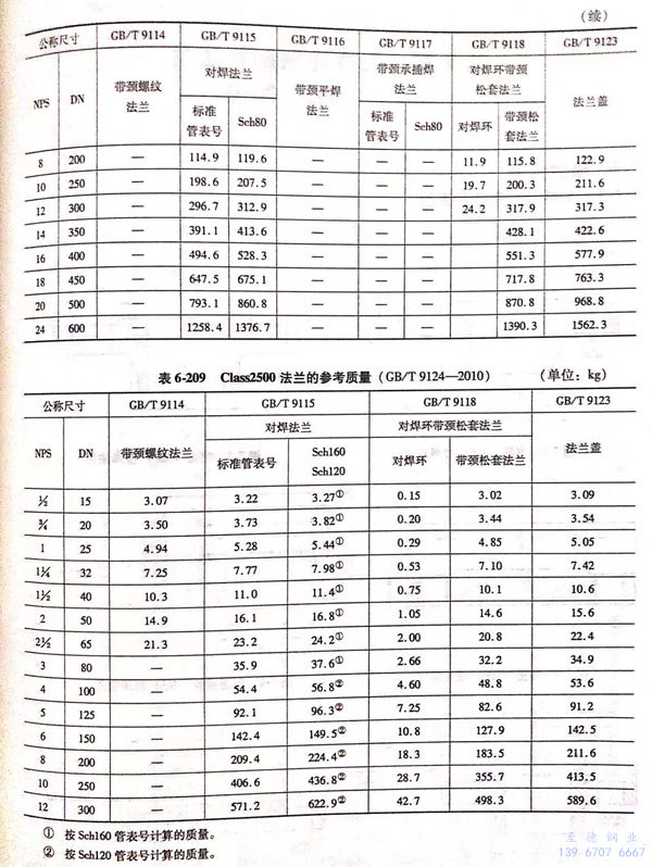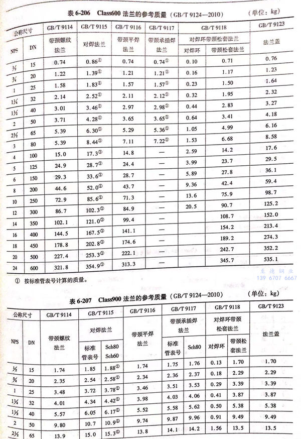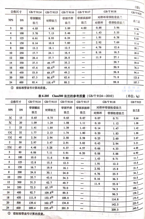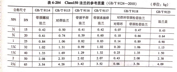用 Class 標記的法(fa)蘭(包括(kuo) Class 150 ~ Class 2500 共6個(ge)壓力級的法(fa)蘭)的參考(kao)質量見表6-204~表6-209。
