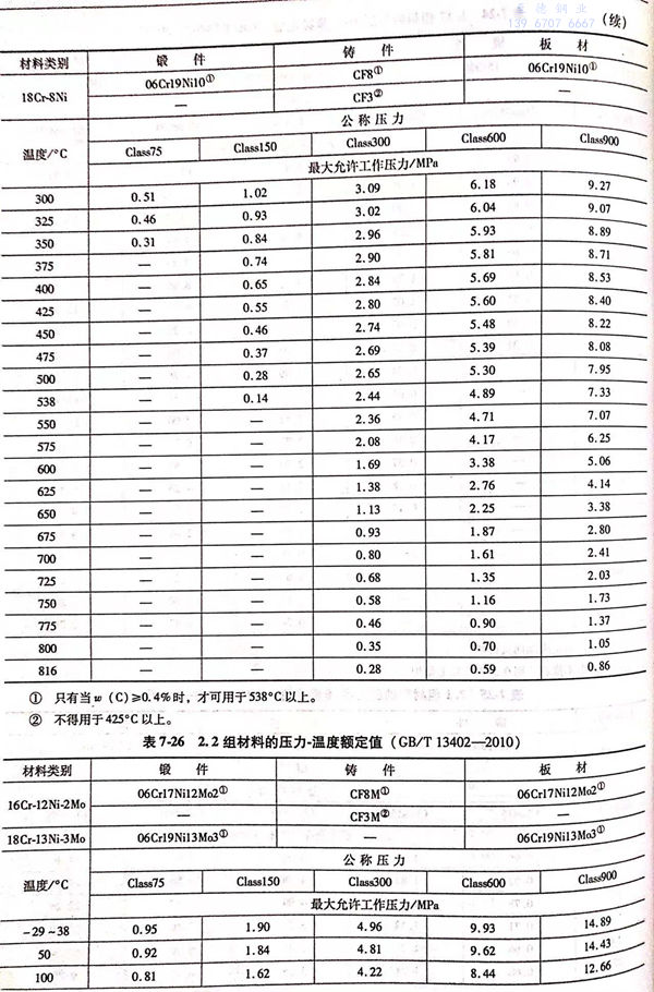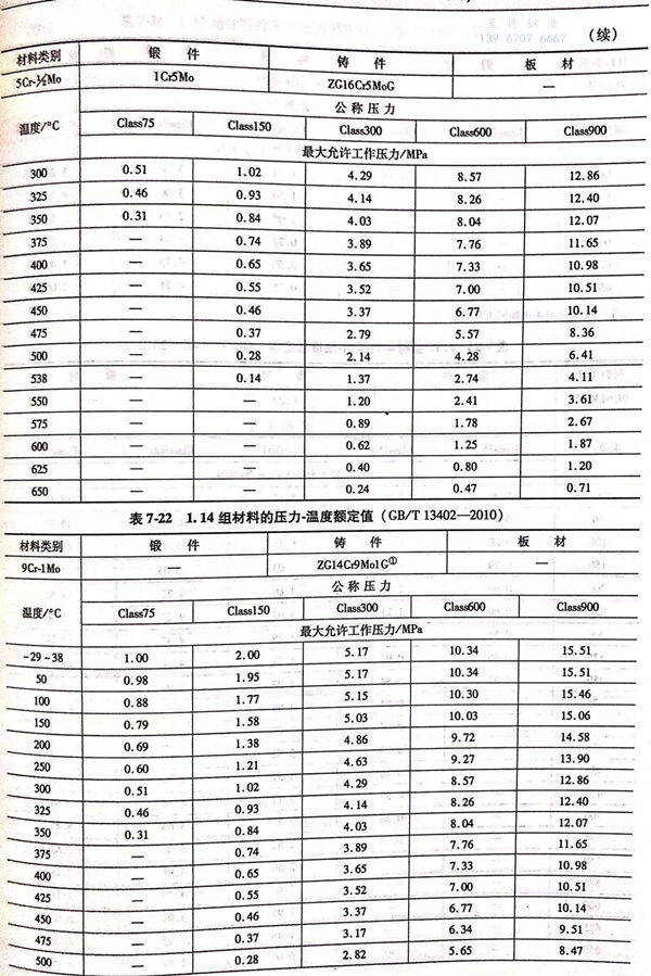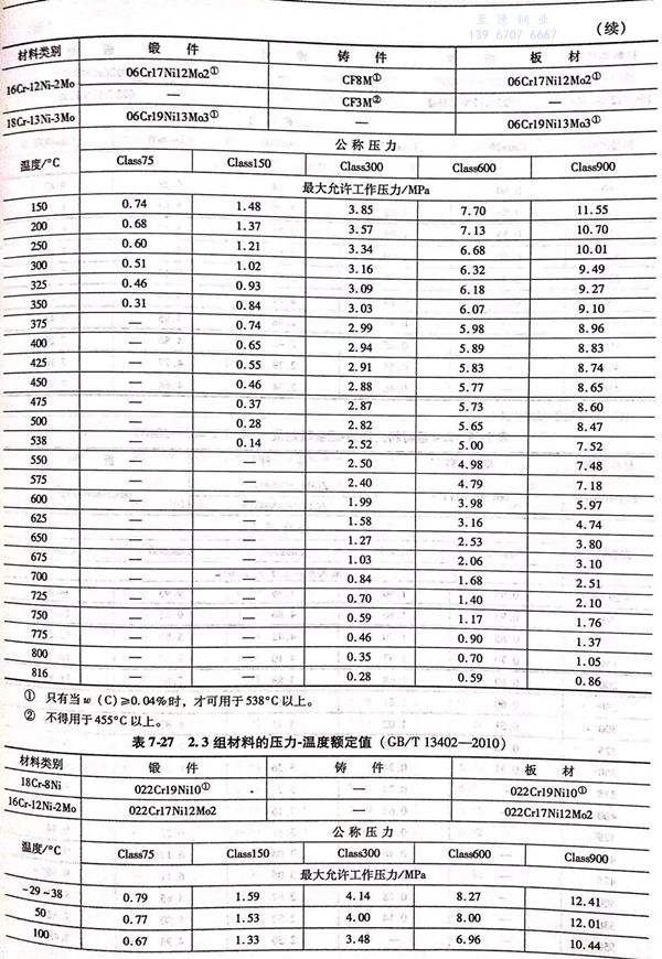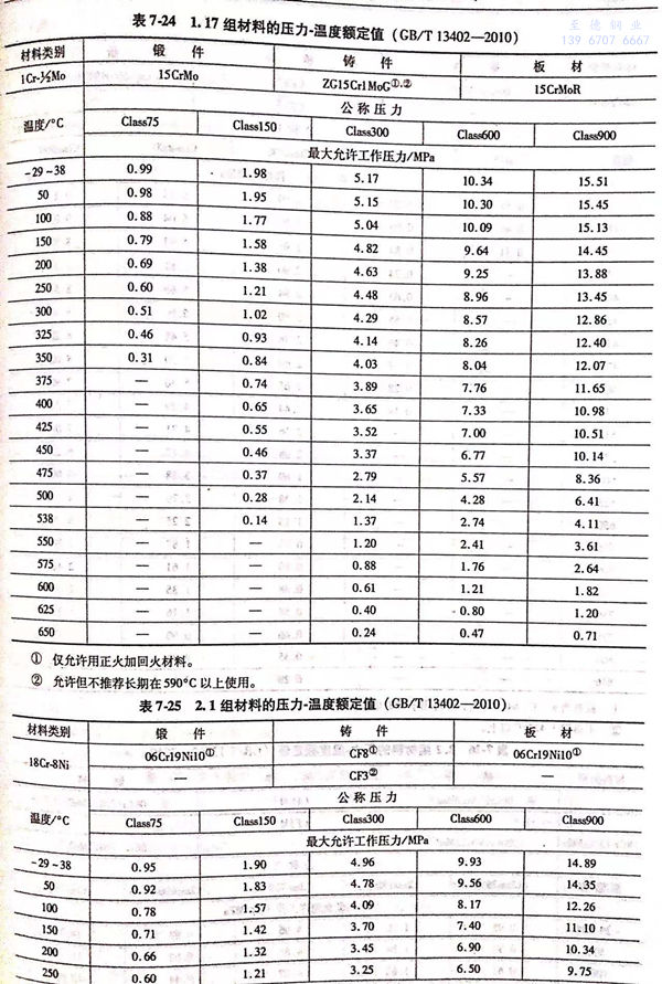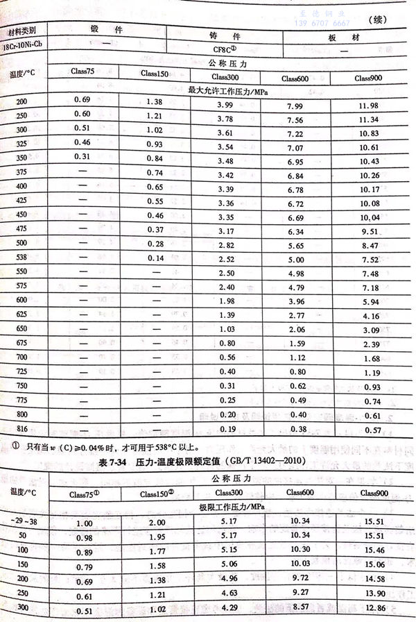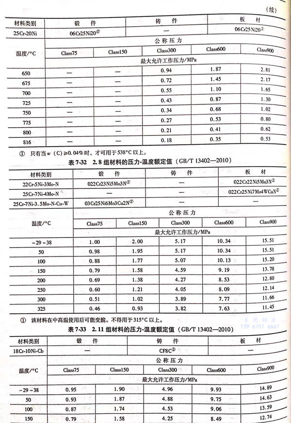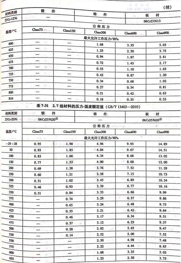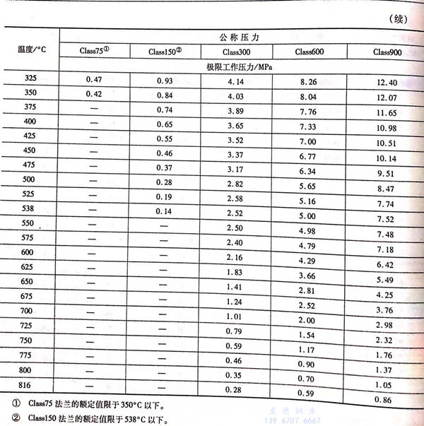 各組材料的不銹鋼法蘭(Class75~Class900)的壓力-溫度額定值見表7-14~表7-33。對于不銹鋼法(fa)蘭(lan)的壓力-溫度極限額定值見表7-34.表7-14~表7-33所規定的法蘭壓力-溫度額定值不得超過表7-34規定的極限額定值。