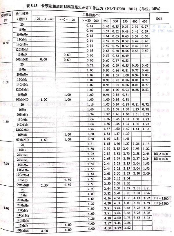 長(chang)頸對焊法(fa)蘭的工(gong)作(zuo)溫(wen)度為(wei)-70~450°℃,其適(shi)用材料及最大允許工(gong)作(zuo)壓力見表8-13。