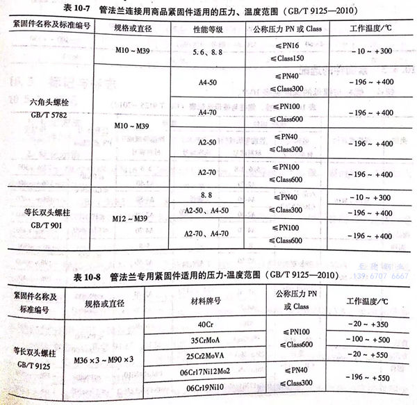 根據緊(jin)固件(jian)的(de)(de)型式與尺寸(cun)、性能等級或材料牌號(hao)確(que)定其(qi)適(shi)用(yong)的(de)(de)壓(ya)力(li)和(he)工作溫度(du)范(fan)圍。對于管法蘭連接用(yong)商品緊(jin)固件(jian)適(shi)用(yong)的(de)(de)壓(ya)力(li)、溫度(du)范(fan)圍見表10-7;對于管法蘭專用(yong)緊(jin)固件(jian)適(shi)用(yong)的(de)(de)壓(ya)力(li)、溫度(du)范(fan)圍見表10-8.