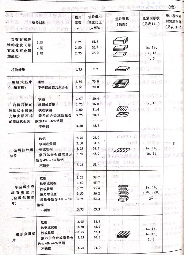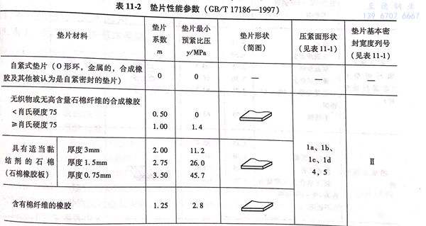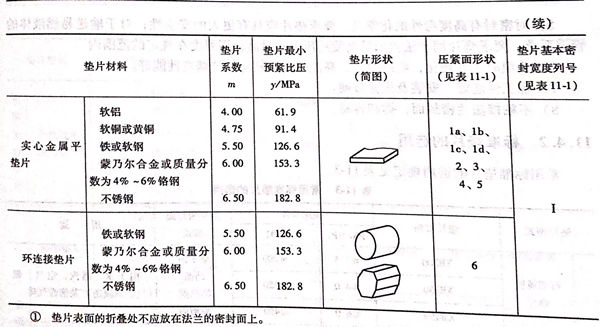 不(bu)銹鋼(gang)法蘭墊片(pian)最小(xiao)預緊(jin)比壓和墊片(pian)系(xi)數(shu)由(you)實驗確定(ding),它(ta)們是僅(jin)與墊片(pian)材(cai)料及法蘭密封面形式有關的特性(xing)(xing)參(can)數(shu)。規范墊片(pian)特性(xing)(xing)參(can)數(shu)或墊片(pian)性(xing)(xing)能參(can)數(shu)m及y值見表11-2。