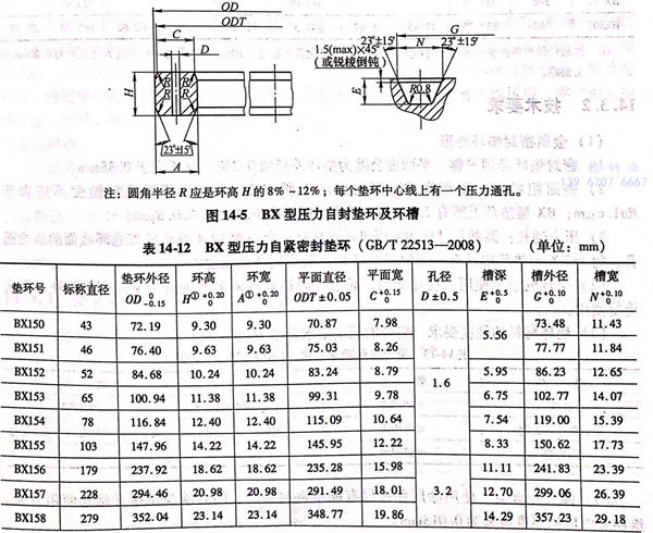 BX 型壓力自(zi)緊墊環及環槽如圖 14-5 所示(shi),尺寸(cun)見表 14-12。