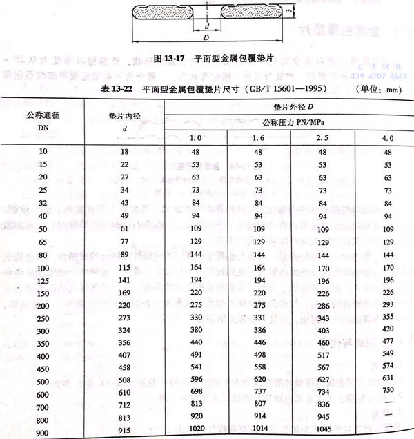 平面型金屬包覆墊片的尺寸見圖 13-17 和 表 13-22、表 13-23。