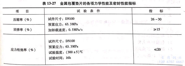 金屬包覆(fu)墊片的各項(xiang)力學性能及密封性能指標見表13-27.