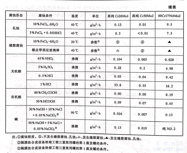 表2-31示出高純Cr30Mo2、008Cr30Mo2、,C26Mo1 及(ji)00Cr17Ni14Mo2在各種腐(fu)蝕(shi)條件下腐(fu)蝕(shi)試驗結(jie)果。