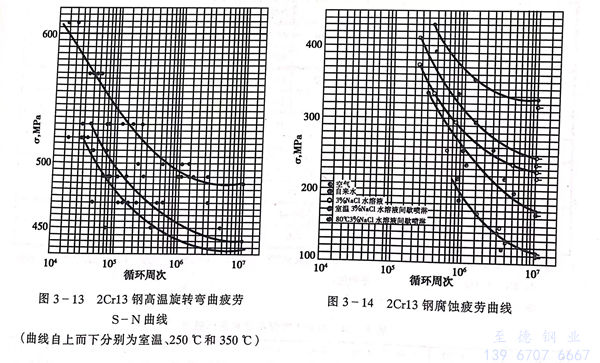 2Cr13、20Cr13、420 不銹(xiu)鋼(1000℃油淬,700℃回火)的高溫疲勞(lao)和腐蝕疲勞(lao)行為(wei)分(fen)別見(jian)(jian)圖3-13和圖3-14。2Cr13鋼光滑和缺(que)口試樣彎曲(qu)疲勞(lao)極限見(jian)(jian)表3-22。