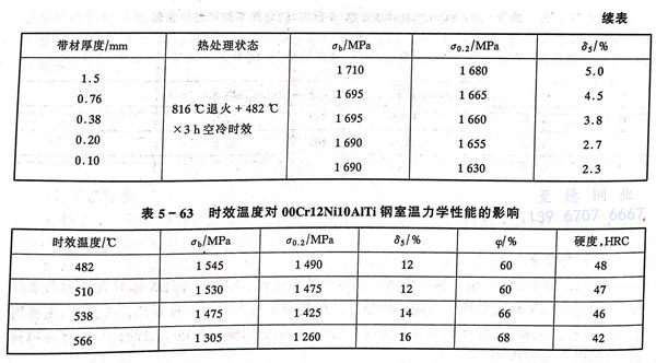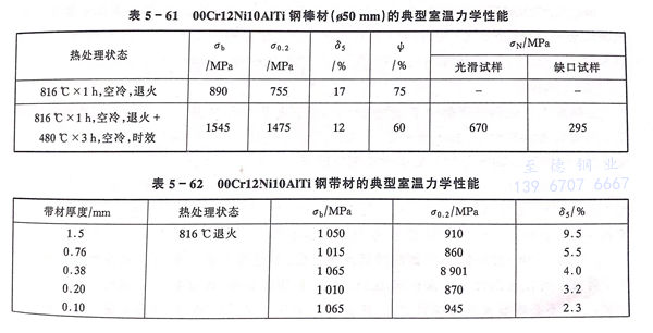 00Cr12Ni10AlTi 不(bu)(bu)銹(xiu)鋼在退火(huo)條件下具有較高的(de)抗拉強度(du)和屈服強度(du),且塑性(xing)和韌(ren)性(xing)良好。通(tong)過簡單的(de)時(shi)效(xiao)處(chu)理,其強度(du)水平(ping)較退火(huo)狀(zhuang)態提高1倍,同時(shi)保留了足夠的(de)塑韌(ren)性(xing)。00Cr12Ni10AITi 不(bu)(bu)銹(xiu)鋼棒材、帶材及時(shi)效(xiao)處(chu)理對室溫力學性(xing)能的(de)影響見表(biao)5-61至(zhi)表(biao)5-63。