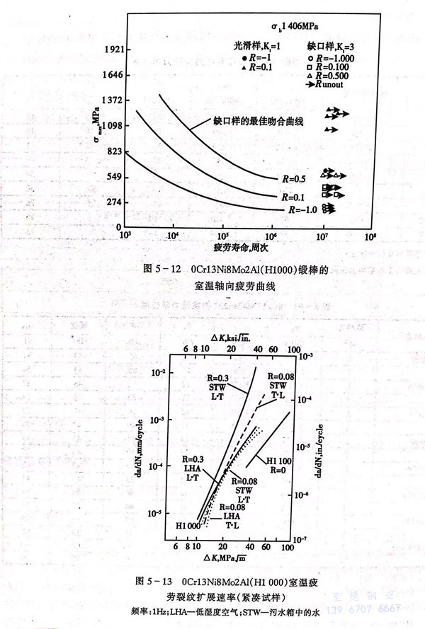 04Cr13Ni8Mo2Al、0Cr13Ni8Mo2Al、PH13-8Mo 不銹鋼的軸向疲勞性能和裂紋(wen)擴展速率分(fen)別見(jian)圖(tu) 5-12 和 圖(tu) 5-13 。緊湊試樣的斷裂韌性數據見(jian)表 5-54 。