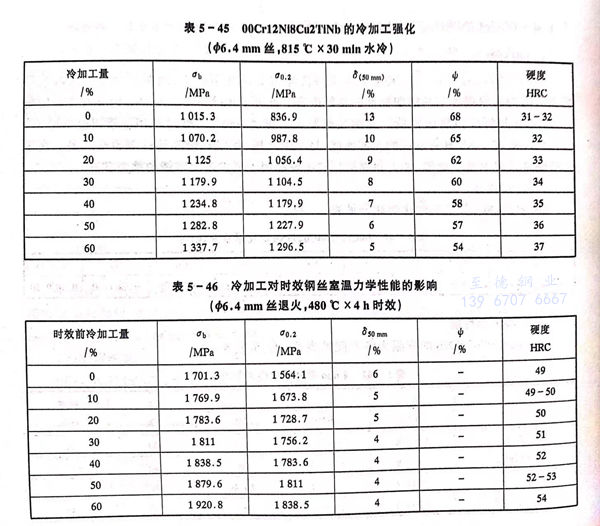 盡管(guan)此鋼(gang)在退(tui)火狀態下(xia)是馬(ma)氏體組織,但鋼(gang)的(de)(de)硬(ying)度僅為30~35HRC,易于進(jin)(jin)行(xing)冷(leng)加工,鋼(gang)的(de)(de)冷(leng)加工硬(ying)化傾(qing)向(xiang)很低(見表(biao)5-45),不需中間退(tui)火即可進(jin)(jin)行(xing)較大變形量(liang)的(de)(de)冷(leng)加工,最終(zhong)熱(re)處理(li)前進(jin)(jin)行(xing)冷(leng)變形,可獲得較高的(de)(de)拉伸(shen)強(qiang)度和屈服(fu)強(qiang)度。