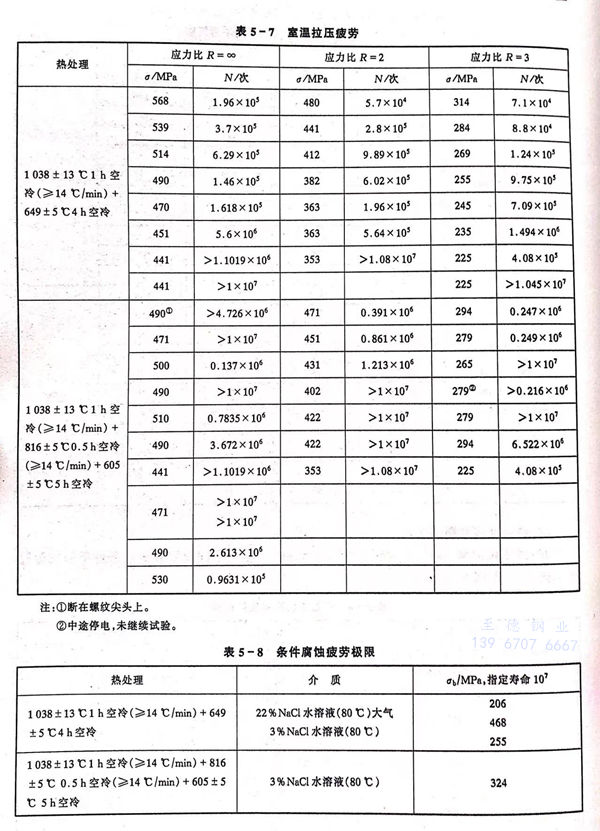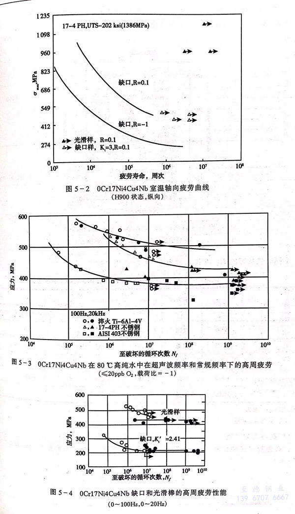 0Cr17Ni4Cu4Nb、05Cr17Ni4Cu4Nb、17-4PH 不銹鋼的疲勞性能見表5-6至(zhi)(zhi)表5-8,在不同介質和試驗條(tiao)件下的疲勞行為見圖5-2至(zhi)(zhi)圖5-4。
