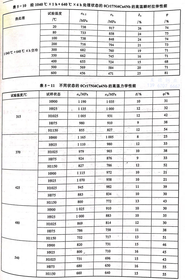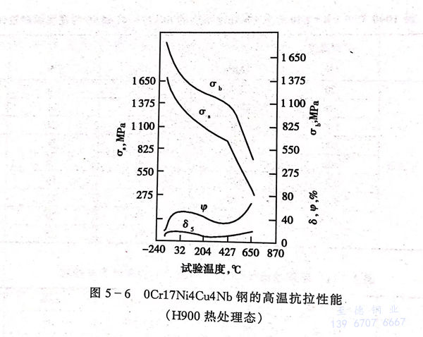 0Cr17Ni4Cu4Nb、05Cr17Ni4Cu4Nb、17-4PH 銹鋼的高溫(wen)瞬(shun)時拉伸性能見表5-10、表5-11和圖(tu)5-6。