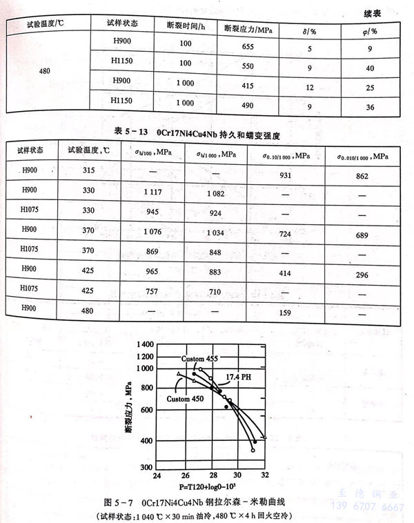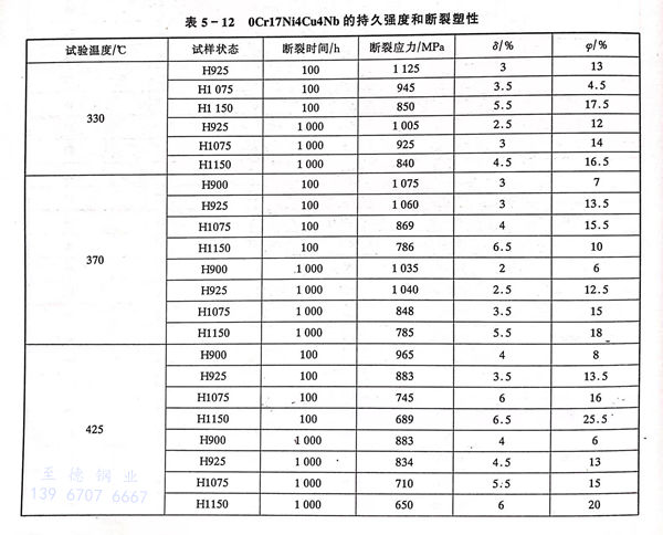 0Cr17Ni4Cu4Nb、05Cr17Ni4Cu4Nb、17-4PH 不銹鋼的(de)高溫長(chang)時力學性能(neng)見表5-12、表5-13和圖5-7。