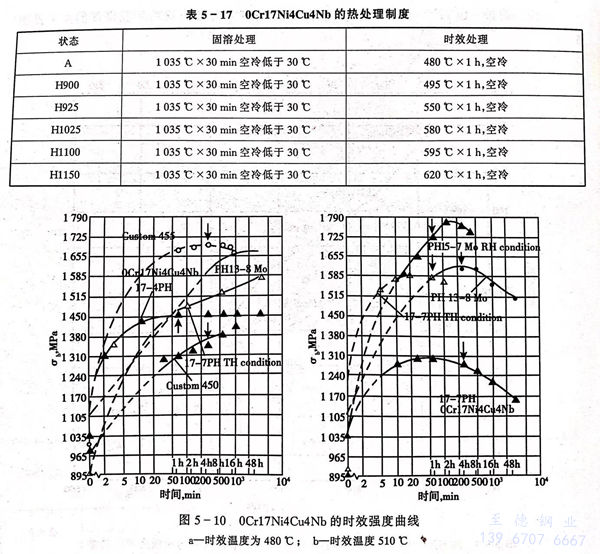 在固溶后鋼(gang)獲得(de)A狀態(馬氏體(ti))后,隨后可進行時效(xiao)處理(li),亦可以在固溶后采用過時效(xiao)處理(li)后再重復固溶,而后熱處理(li)的(de)方式。(0Cr17Ni4Cu4Nb)17-4PH不銹(xiu)鋼(gang)可采用不同的(de)時效(xiao)處理(li)調整(zheng)其強度水平,見圖(tu)5-10。