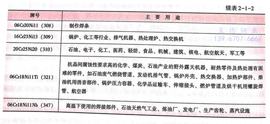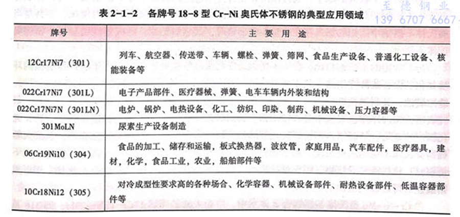 18-8型Cr-Ni奧氏體不銹鋼,隨著不同性能的差異,演變出12Cr17Ni7、12Cr18Ni9、Y12Cr18Ni9、06Cr19Ni10、06Cr18Ni11Ti、06Cr18Ni11Nb、022Cr17Ni7、022Cr19Ni10、022Cr19Ni10N等牌號,各牌號成分上略有差異,用途也不盡相同(見表2-1-1)。