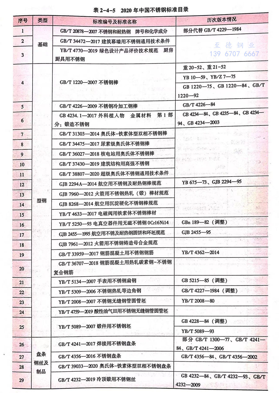 隨著(zhu)我(wo)國不銹(xiu)鋼(gang)工藝與裝(zhuang)備水平的(de)(de)不斷突破(po)和(he)(he)進步,使(shi)制(zhi)造成(cheng)本大(da)幅下降(jiang),加之人們對不銹(xiu)鋼(gang)產品全生命(ming)周期綜合成(cheng)本的(de)(de)重視(shi)程度(du)(du)不斷提高(gao)(gao),極大(da)地推(tui)動(dong)了不銹(xiu)鋼(gang)在各產業大(da)量使(shi)用,進一(yi)步提高(gao)(gao)了不銹(xiu)鋼(gang)標(biao)(biao)準(zhun)制(zhi)修(xiu)訂的(de)(de)速度(du)(du)和(he)(he)數量,從2011年至2020年,我(wo)國共制(zhi)修(xiu)訂不銹(xiu)鋼(gang)標(biao)(biao)準(zhun)89項(xiang),其(qi)中(zhong)新(xin)制(zhi)定了核電(dian)、汽車、城市(shi)軌道車輛、貨運車輛、石油(you)、化工、船舶(bo)、橋(qiao)梁、電(dian)力(li)、環保、建(jian)筑及航天(tian)航空等重點領域急需標(biao)(biao)準(zhun)63項(xiang)(國家標(biao)(biao)準(zhun)41項(xiang),國家軍用標(biao)(biao)準(zhun)10項(xiang),行(xing)業標(biao)(biao)準(zhun)12項(xiang)),不銹(xiu)鋼(gang)標(biao)(biao)準(zhun)總數達到(dao)115項(xiang)(見表2-4-5)。這些(xie)標(biao)(biao)準(zhun)的(de)(de)制(zhi)修(xiu)訂與實施(shi),極大(da)地推(tui)動(dong)了鐵素(su)體(ti)型、奧氏體(ti)-鐵素(su)體(ti)型、超級不銹(xiu)鋼(gang)型和(he)(he)高(gao)(gao)強度(du)(du)不銹(xiu)鋼(gang)等新(xin)牌號、新(xin)品種研發(fa)與應(ying)用。