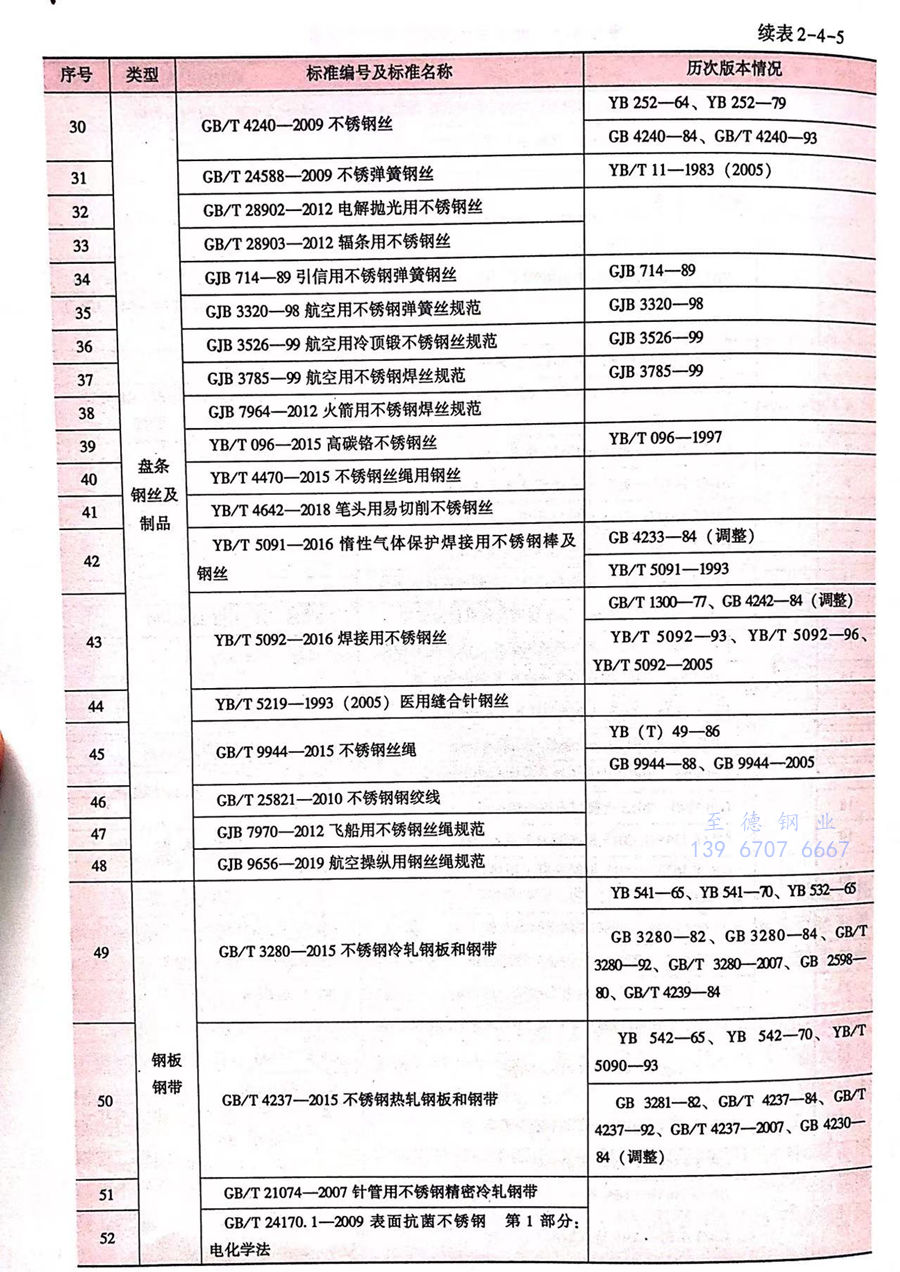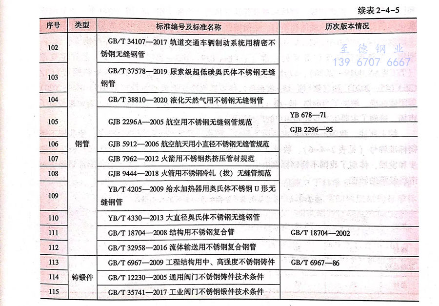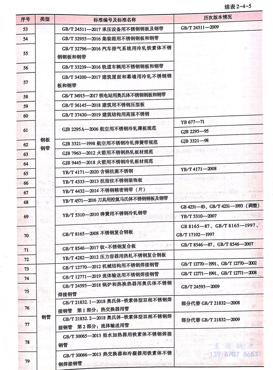 《高壓鍋爐用無縫鋼管》(GB 5310-2008)、《石油裂化用無縫鋼管》(GB 9948-2013)、《承壓設備用不銹鋼鋼板及鋼帶》(GB 24511-2009)、《核電站用無縫鋼管 第3部分:不銹鋼無縫鋼管》(GB 24512.3-2014)、《承壓設備用無縫復合鋼管》(GB 28883-2013)、《核電站用奧氏體不銹鋼(gang)焊接鋼(gang)管》(GB 30813-2014)、《核電站用奧氏體不銹鋼棒》(GB/T36027-2018)。同時,還廢止了《磁頭用不銹鋼冷軋鋼帶》(YB/T 085-2007)、《彩色顯像管彈簧用不銹鋼冷軋鋼帶》(YB/T 110-2011)、《手表用不銹鋼冷軋鋼帶》(YB/T 5133-2007)、《S型釬焊不銹鋼金屬軟管》(YB/T 5307-2006)等4項行業標準(見表2-4-5)。