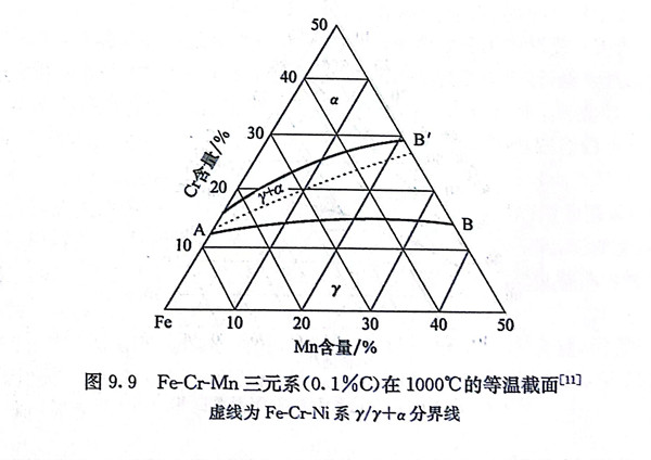 圖(tu)9.7為Fe-Cr-Ni三元系(xi)在(zai)高(gao)溫的相圖(tu),可以看出,由于(yu)鎳的存(cun)在(zai),在(zai)1100℃下(xia),y相區擴展到(dao)較(jiao)高(gao)的鉻(ge)含量,這種(zhong)(zhong)高(gao)溫穩定的γ相急冷(leng)到(dao)室(shi)溫,形成如圖(tu)9.8所示(shi)的室(shi)溫下(xia)的各種(zhong)(zhong)亞(ya)穩相及穩定相。