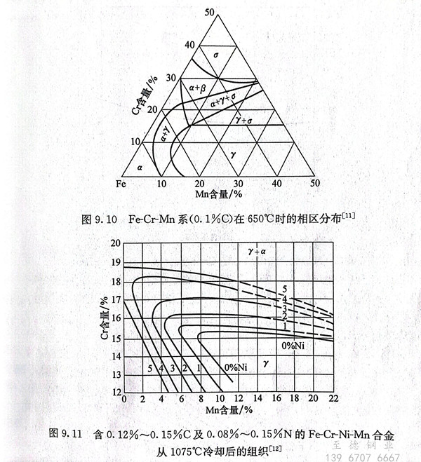 雖然錳和鎳一樣可以擴展和穩定y相,但在奧氏(shi)體不銹鋼(gang)中用錳完全代替鎳是有困難的。根據Fe-Cr-Mn三元相圖(圖9.9及圖9.10),當鉻含量大于15%時,錳含量的增加并不能避免α相的出現。為了節約鎳,在18Cr-8Ni 奧氏體不銹鋼中,可以用8%Mn代替其中的4%Ni。圖9.11為Fe-Cr-Ni-Mn相圖,可以看出,在Cr-Mn鋼中加入少量的氮可使獲得奧氏體組織所需的鎳含量大大減少。圖9.12也表明,在含18.5%Cr的鋼中,加入少量的氮可以顯著減少為獲得奧氏體所需的鎳含量。