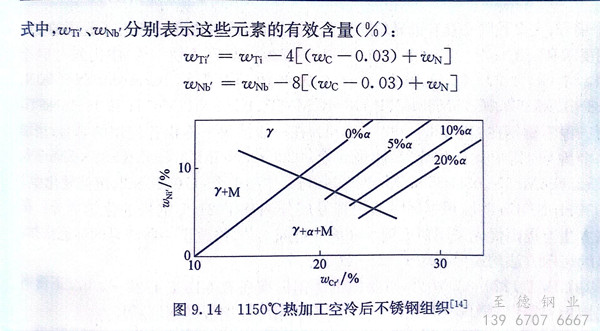 圖(tu)9.14是(shi)從大量(liang)Cr-Ni奧氏體不(bu)銹鋼的(de)試驗數據中(zhong)整理得到的(de),適用(yong)于1150℃熱加工后冷卻狀態(tai)的(de)不(bu)銹鋼組織。該圖(tu)考慮了元素間的(de)交互作用(yong):