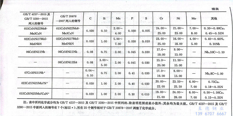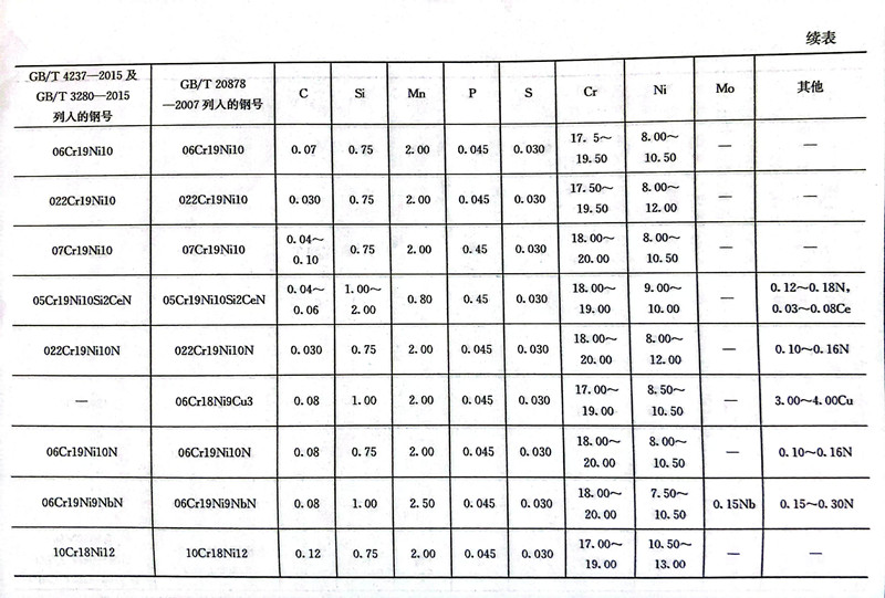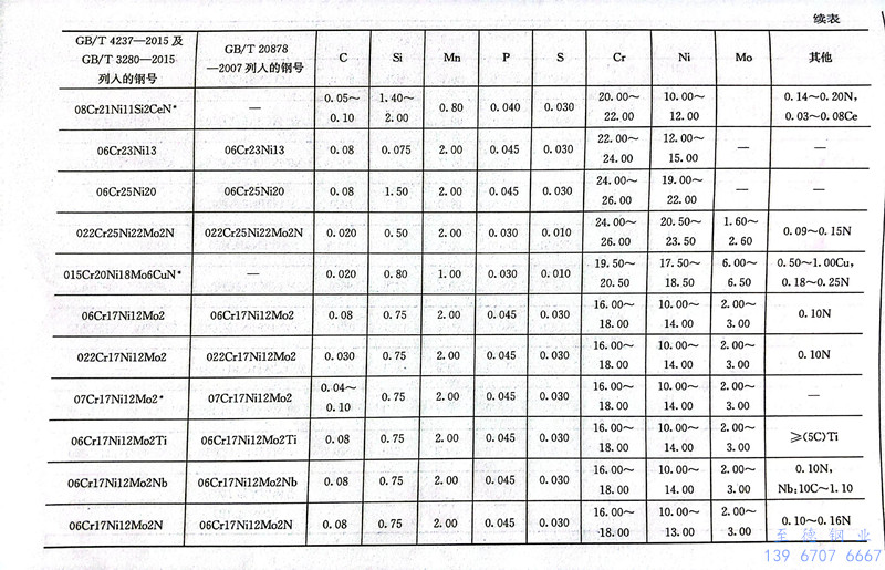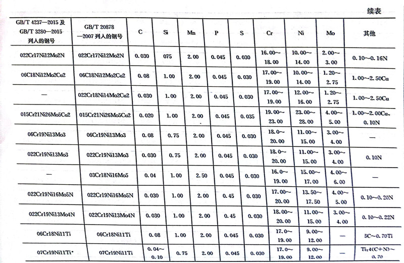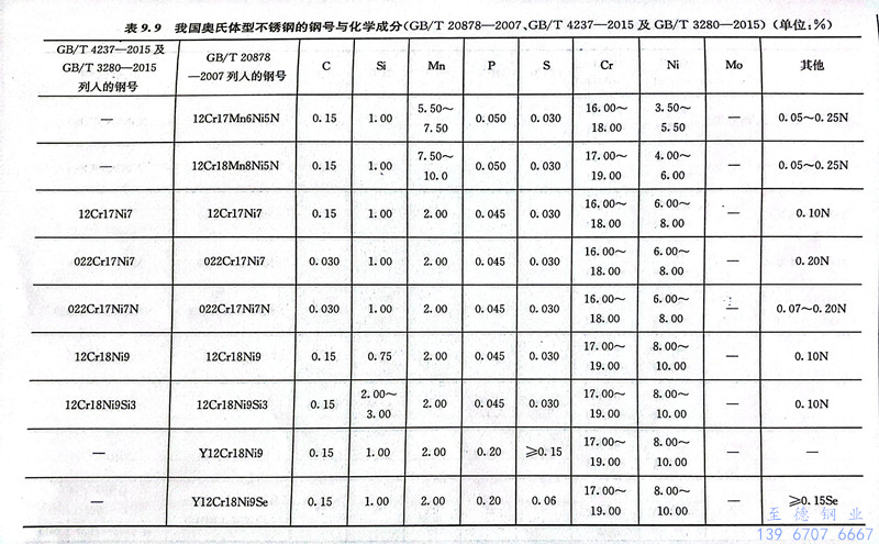 在(zai)GB/T 20878-2007中列(lie)入(ru)了42個奧(ao)氏體(ti)型不(bu)(bu)(bu)銹(xiu)(xiu)鋼(gang)的(de)(de)(de)牌號。在(zai)新修訂的(de)(de)(de)GB/T 4237-2015及(ji)GB/T 3280-2015中列(lie)人(ren)的(de)(de)(de)奧(ao)氏體(ti)型不(bu)(bu)(bu)銹(xiu)(xiu)鋼(gang)的(de)(de)(de)牌號有(you)(you)39個,有(you)(you)7個是新加入(ru)的(de)(de)(de),其中5個是GB/T 20878-2007中未(wei)列(lie)入(ru)的(de)(de)(de)。表(biao)9.9為GB/T 20878-2007、GB/T 4237-2015及(ji)GB/T 3280-2015中列(lie)入(ru)的(de)(de)(de)我(wo)國(guo)(guo)奧(ao)氏體(ti)型不(bu)(bu)(bu)銹(xiu)(xiu)鋼(gang)的(de)(de)(de)鋼(gang)號及(ji)其化學(xue)成分。表(biao)9.10為我(wo)國(guo)(guo)奧(ao)氏體(ti)型不(bu)(bu)(bu)銹(xiu)(xiu)鋼(gang)新舊牌號和相應美國(guo)(guo)、日本(ben)和國(guo)(guo)際(ji)標準牌號的(de)(de)(de)對照。表(biao)9.11為奧(ao)氏體(ti)型不(bu)(bu)(bu)銹(xiu)(xiu)鋼(gang)鋼(gang)棒的(de)(de)(de)熱處(chu)理與力學(xue)性能。表(biao)9.12為奧(ao)氏體(ti)型不(bu)(bu)(bu)銹(xiu)(xiu)鋼(gang)鋼(gang)板和鋼(gang)帶熱處(chu)理后的(de)(de)(de)力學(xue)性能。