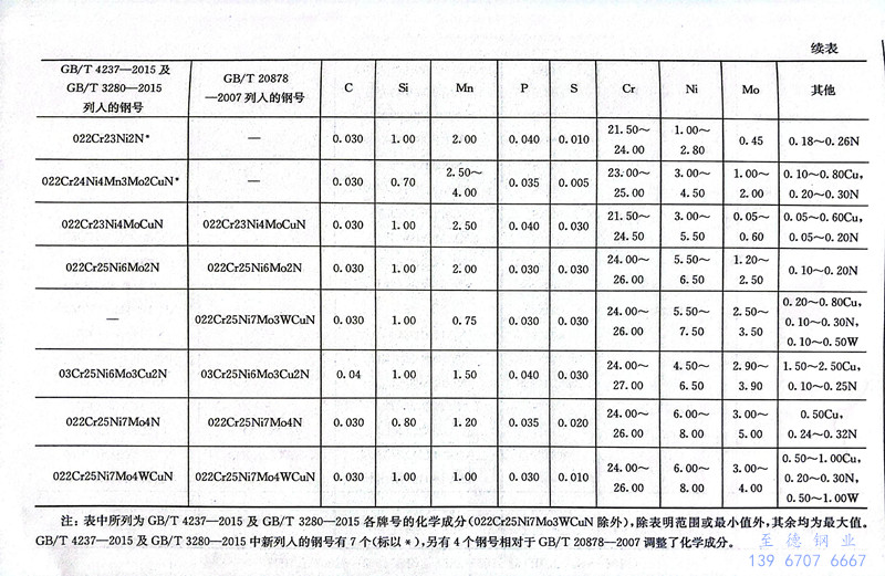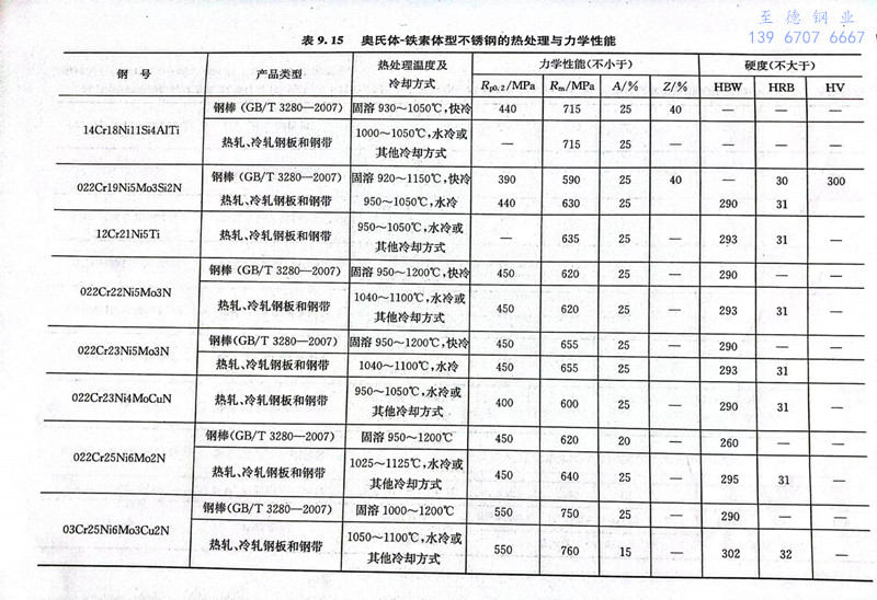 我國(guo)在(zai)(zai)20世紀70年代(dai)中(zhong)期開(kai)始發展雙(shuang)相不(bu)銹(xiu)鋼(gang)(gang),在(zai)(zai)GB 1220-84和GB 1220-92中(zhong)列入(ru)(ru)了3個(ge)(ge)鋼(gang)(gang)號(hao)。在(zai)(zai)制(zhi)定(ding)GB/T 20878-2007時,吸(xi)收(shou)了國(guo)內外(wai)已開(kai)發出的一(yi)些性能良好的雙(shuang)相鋼(gang)(gang)不(bu)銹(xiu)鋼(gang)(gang),共列入(ru)(ru)了11個(ge)(ge)鋼(gang)(gang)號(hao)。2015年修訂的GB/T 4237-2015及GB/T 3280-2015中(zhong)列入(ru)(ru)的奧氏體-鐵(tie)素(su)體不(bu)銹(xiu)鋼(gang)(gang)牌號(hao)有(you)17個(ge)(ge),其(qi)中(zhong)10個(ge)(ge)是已列入(ru)(ru)GB/T 20878-2007的牌號(hao),新添(tian)加的有(you)7個(ge)(ge),其(qi)化(hua)學成(cheng)分及其(qi)固溶處理(li)后的力學性能分別見表(biao)9.13和表(biao)9.15。