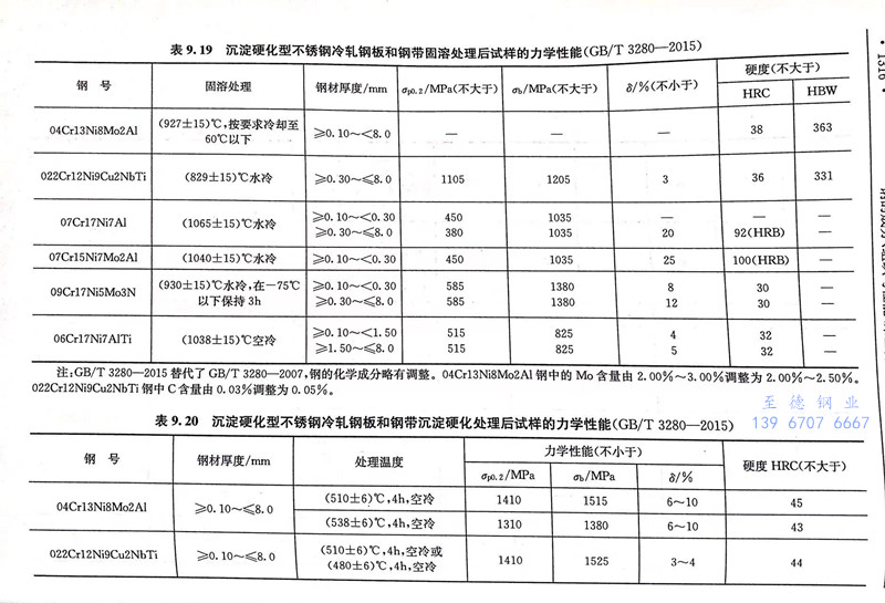 022Cr12Ni9Cu2NbTi、Custom 455 不銹鋼(gang)在(zai)溫(wen)度(du)(du)區間900~1260℃極易鍛(duan)(duan)造(zao),適(shi)宜(yi)的(de)(de)鍛(duan)(duan)造(zao)加(jia)熱和(he)(he)均熱溫(wen)度(du)(du)為1040~1150℃,終鍛(duan)(duan)溫(wen)度(du)(du)應控(kong)制在(zai)815~925℃,可(ke)獲得(de)(de)較細的(de)(de)晶粒尺寸,鍛(duan)(duan)后(hou)(hou)空冷(leng)。鍛(duan)(duan)后(hou)(hou)應進行固溶處理(li)(li),固溶溫(wen)度(du)(du)為816~843℃,隨后(hou)(hou)快冷(leng),若截面較小可(ke)以水淬(cui),組織(zhi)為全馬氏體組織(zhi),硬度(du)(du)為30~35HRC。生產企(qi)業一般(ban)均以固溶狀態(tai)的(de)(de)產品供貨,用(yong)戶加(jia)工(gong)后(hou)(hou)只(zhi)需(xu)進行時(shi)效(xiao)(xiao)處理(li)(li)以獲得(de)(de)最后(hou)(hou)的(de)(de)性能。時(shi)效(xiao)(xiao)溫(wen)度(du)(du)可(ke)在(zai)480~560℃選擇,保溫(wen)4h,空冷(leng),時(shi)效(xiao)(xiao)后(hou)(hou)的(de)(de)尺寸變化僅為-0.001mm/mm。固溶和(he)(he)時(shi)效(xiao)(xiao)處理(li)(li)后(hou)(hou)鋼(gang)的(de)(de)力學性能見表(biao)9.19和(he)(he)表(biao)9.20。
