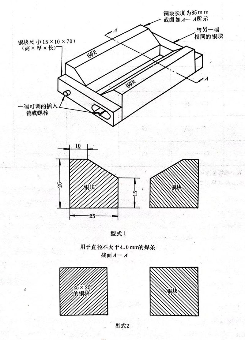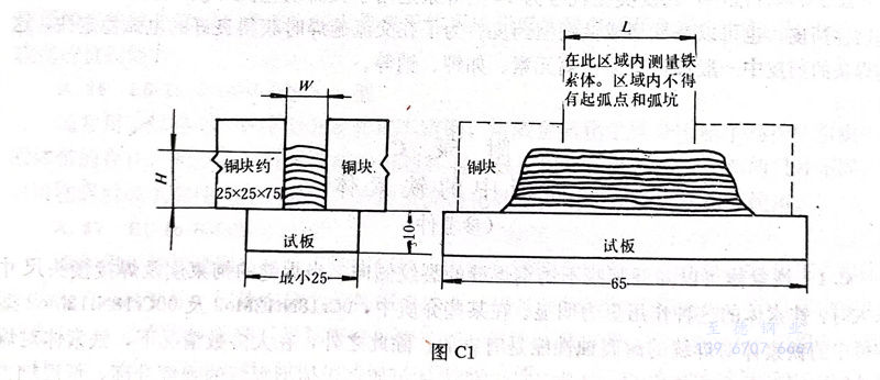 4.2 將兩(liang)平行的(de)(de)銅塊(kuai)置于試(shi)板之(zhi)上(shang),銅塊(kuai)最好采用圖C2中(zhong)的(de)(de)形式。兩(liang)銅塊(kuai)間的(de)(de)距離及焊(han)(han)(han)(han)接(jie)電(dian)流應符合下表的(de)(de)規定。應盡(jin)可能采用短弧焊(han)(han)(han)(han)接(jie),焊(han)(han)(han)(han)接(jie)時焊(han)(han)(han)(han)條可以(yi)擺動(dong),但電(dian)弧不(bu)許觸及銅塊(kuai)。各焊(han)(han)(han)(han)道(dao)(dao)(dao)(dao)間的(de)(de)焊(han)(han)(han)(han)接(jie)方向應相互交替,起弧點(dian)和熄(xi)弧點(dian)應在堆焊(han)(han)(han)(han)層(ceng)兩(liang)端。層(ceng)間最高(gao)溫(wen)度為95℃,每條焊(han)(han)(han)(han)道(dao)(dao)(dao)(dao)焊(han)(han)(han)(han)完后(hou),應清(qing)理焊(han)(han)(han)(han)道(dao)(dao)(dao)(dao)表面(mian),并將試(shi)塊(kuai)在水(shui)中(zhong)冷卻20秒以(yi)上(shang)。在最后(hou)一(yi)條焊(han)(han)(han)(han)道(dao)(dao)(dao)(dao)水(shui)冷之(zhi)前,應將試(shi)塊(kuai)在空氣中(zhong)冷卻到430℃以(yi)下。