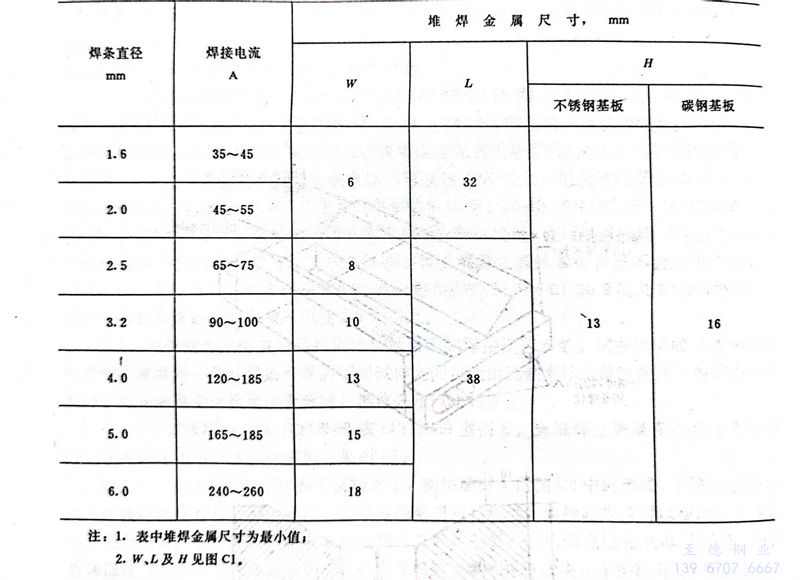 4.1 試(shi)板(ban)材料應(ying)為1Cr18Ni9或0Cr18Ni9型鋼(gang)板(ban)。當堆焊金屬高度符合下表(biao)規定時,也可以用碳鋼(gang)試(shi)板(ban)。試(shi)板(ban)尺(chi)寸見圖(tu)C1。
