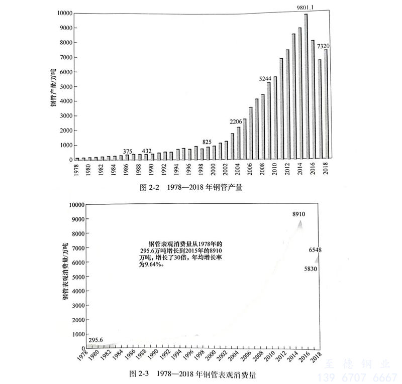 從新中國成立到改革開放近30年,我國不銹鋼管的生產裝備落后,產量低,質量差,完全不能滿足國內建設和發展的需要,每年需花大量的外匯從國外購買鋼管。隨著改革開放打開國門,進入80年代后我國陸續從歐美大規模地引進先進的技術設備,大大地改變了我國不銹鋼管生產裝備的落后局面,使我國鋼管產量從穩步發展走上了快速增長之路。從1978年的168.2萬噸,到1986年不銹鋼管產量達到375.4萬噸,超過了美國;1990年達到431.9萬噸,超過了德國;1999年達到852萬噸,超過了日本,成為世界鋼管生產第一大國。特別是從2000年到2015年的15年間,我國不(bu)銹鋼管行業的產能及產量得到了飛速發展,2004年,中國不(bu)銹鋼管產量達到2207萬噸,超過了世界不銹鋼管歷史上蘇聯1988年所保持的2084萬噸紀錄,2015年我國不銹鋼管產量達到9801.8萬噸的峰值,見圖2-1,占世界鋼管產量65%。這段時間鋼管產量的年均增長率為17%。從1978年的168.2萬噸增長到2015年的9801.8萬噸,不銹(xiu)鋼管產量增長了58倍,年均增長率為11.61%。鋼管表觀消費量從1978年的295.6萬噸增長到2015年的8910萬噸,見圖2-2,增長了30倍,年均增長率為9.64%。