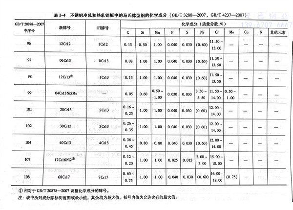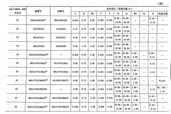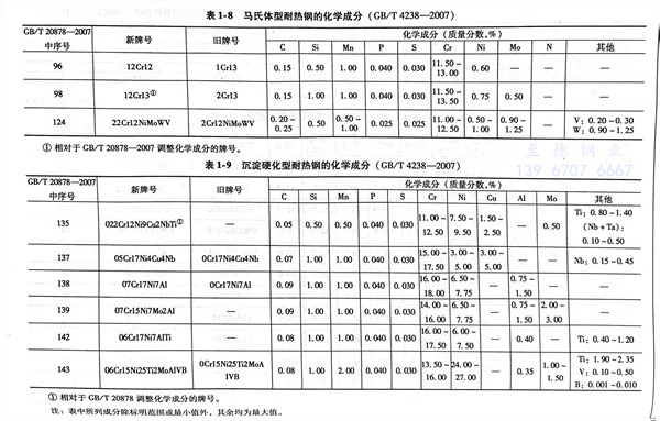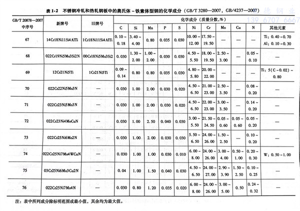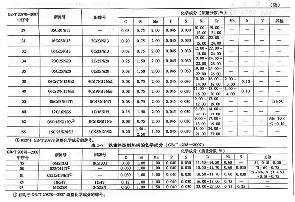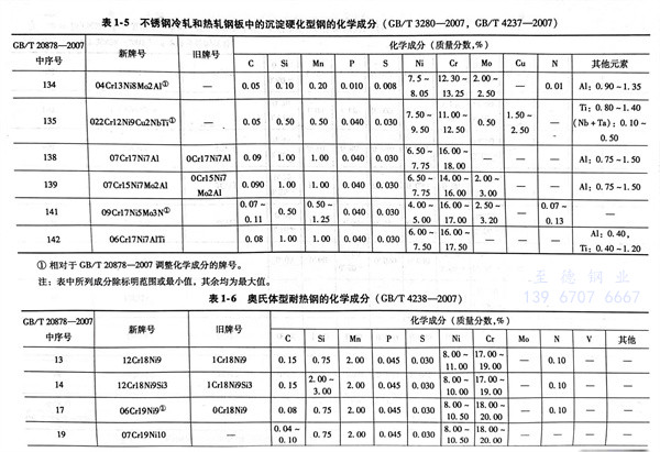 我國國家標準中有不銹鋼鋼板(ban)和耐(nai)熱鋼鋼板。不銹鋼鋼板又分冷軋(GB/T 3280-2007)鋼板和熱軋(GB/T 4237-2007)鋼板,其牌號和化學成分相同。按金相組織可分為奧氏體型鋼、奧氏體-鐵素體型鋼、鐵素體型鋼、馬氏體型鋼和沉淀硬化型鋼等五種,其化學成分分別見表1-1、表1-2、表1-3、表1-4.和表1-5。耐熱鋼板(GB/T4238-2007)按金相組織可分為奧氏體型鋼、鐵素體型鋼、馬氏體型鋼和沉淀硬化型等四種,其化學成分分別見表1-6、表1-7、表1-8和表1-9。從上述表中進行比較,可以看到奧氏體型耐熱鋼板共有15種牌號,其中10種牌號與奧氏體型不銹鋼板相同;鐵素體型耐熱鋼板共有5種牌號,其中有4種與鐵素體型不銹鋼板相同;馬氏體型耐熱鋼板共有3種牌號,全部在馬氏體型不銹鋼板中;而沉淀硬化型耐熱鋼與沉淀硬化型不銹鋼一樣。綜上所述,不銹鋼和耐熱鋼相互之間的許多牌號是相同的,這些牌號既可作為不銹鋼使用,同時也可作為耐熱鋼使用。本書著重介紹這類牌號的不銹鋼板熔焊方面的知識。