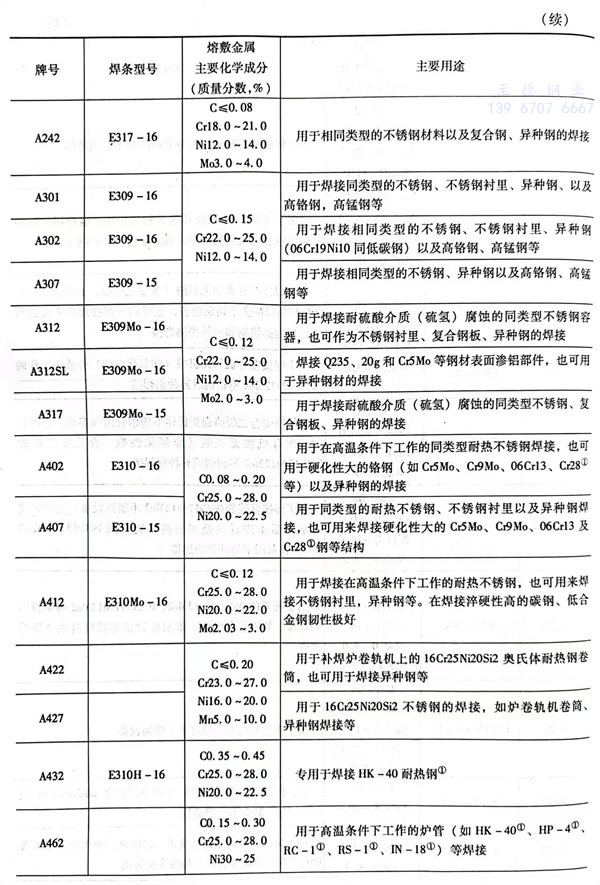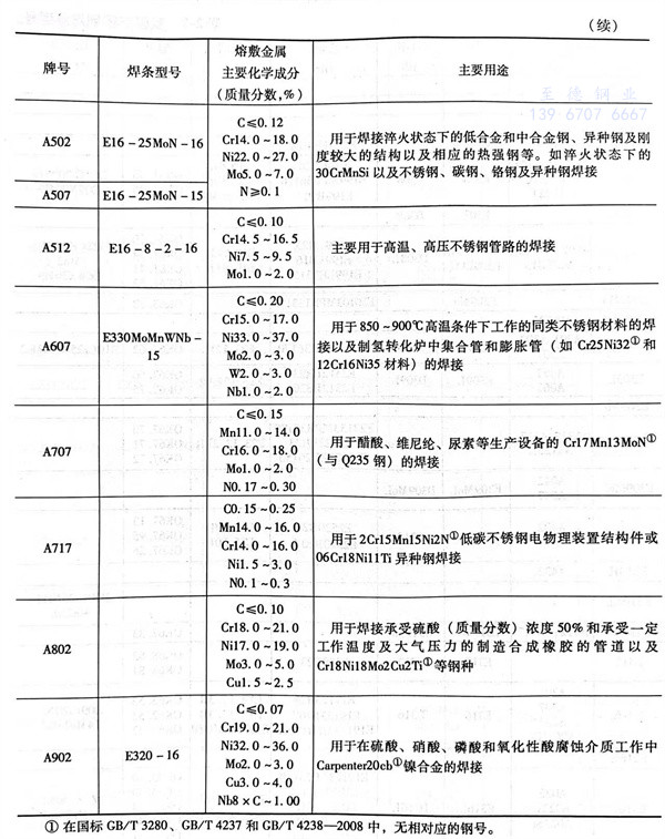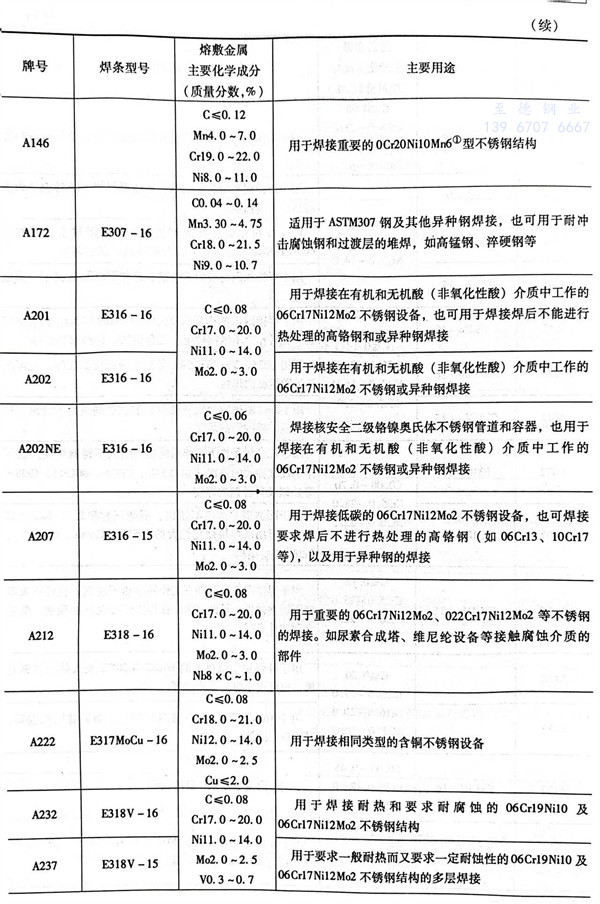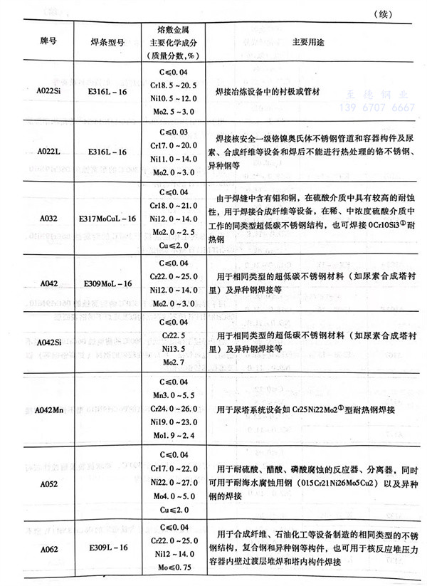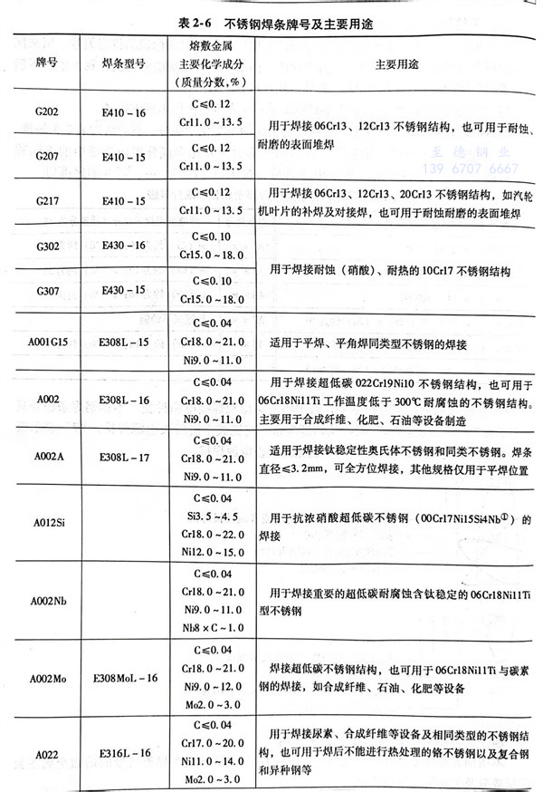 不銹鋼焊條牌號及其符合或相當(dang)于(yu)國標GB/T 983-1995焊條型號的熔(rong)敷金屬(shu)主要(yao)(yao)化學成分及主要(yao)(yao)用途見(jian)表2-6。