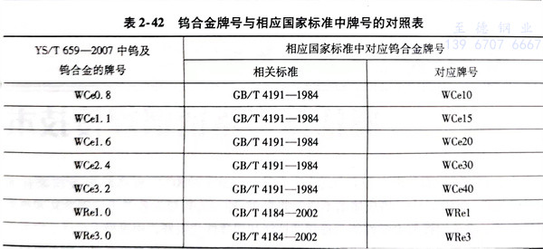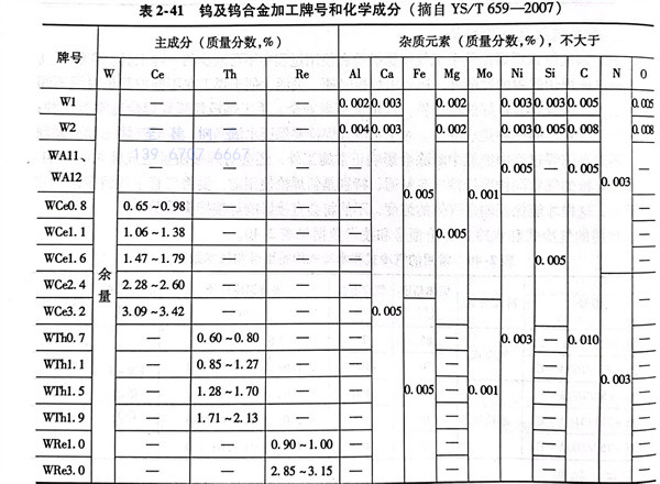 錸(lai)(Re)鎢(wu)極(ji)是在鈍鎢(wu)極(ji)基(ji)礎上加入質(zhi)量分數為3.0%的(de)氧化錸(lai),并且雜(za)質(zhi)元素(su)質(zhi)量分數不大于1%的(de)電(dian)極(ji)。錸(lai)鎢(wu)極(ji)是最近研制的(de)一種新的(de)電(dian)極(ji),錸(lai)呈銀白(bai)色,質(zhi)硬(ying),力(li)學性能好,電(dian)阻高(gao)。錸(lai)是用來制造(zao)電(dian)極(ji)、熱電(dian)偶(ou)、耐高(gao)溫和耐腐(fu)蝕的(de)合金(jin)的(de)材料(liao)。鎢(wu)及鎢(wu)合金(jin)加工牌號和化學成(cheng)分見表2-41(有色金(jin)屬行業(ye)標(biao)準(zhun)YS/T 659-2007)。與其相應國家標(biao)準(zhun)的(de)對照見表2-42。